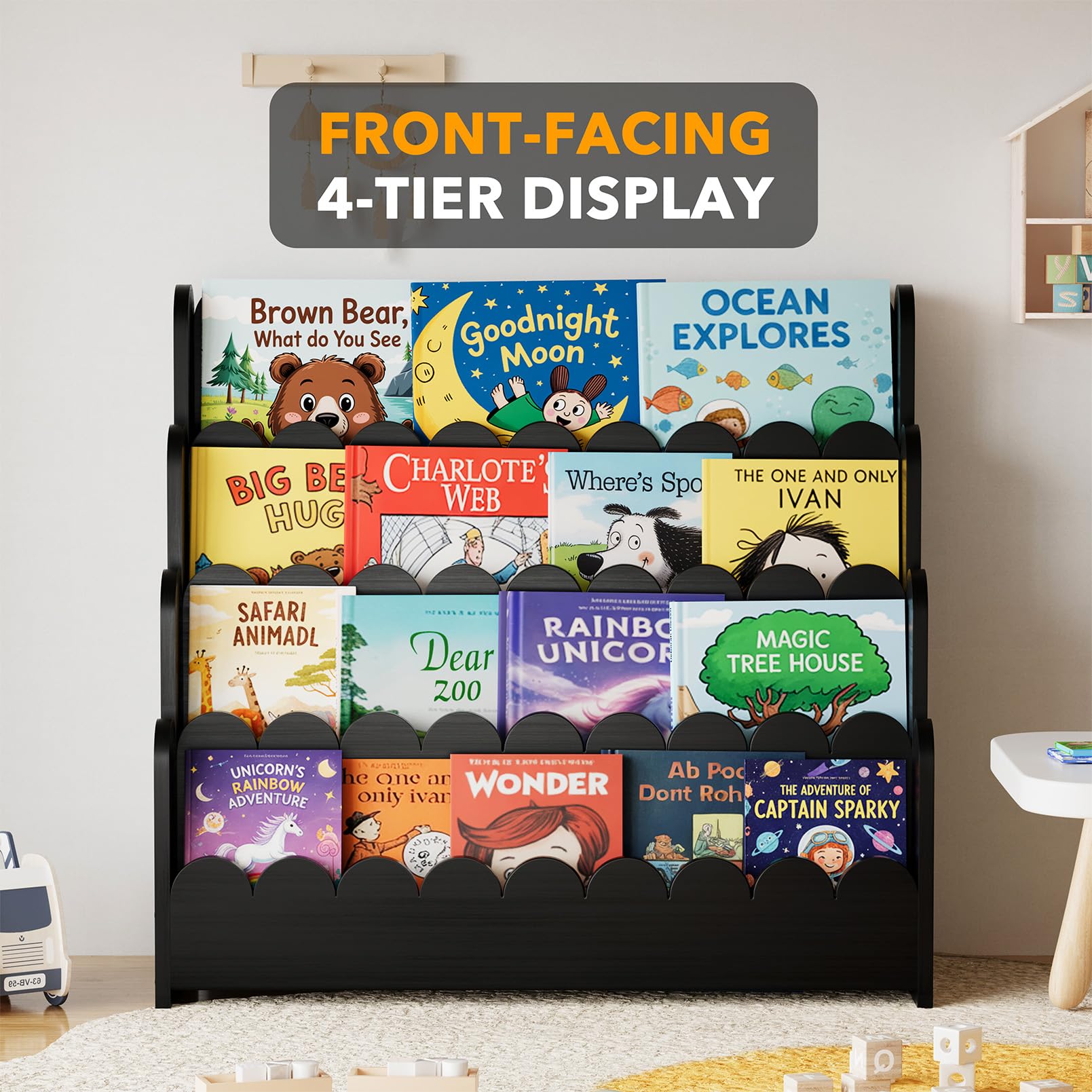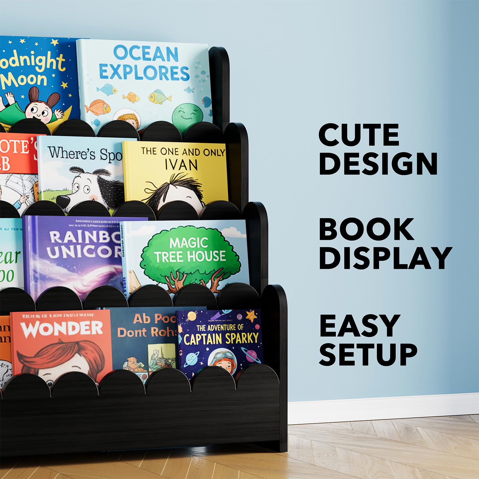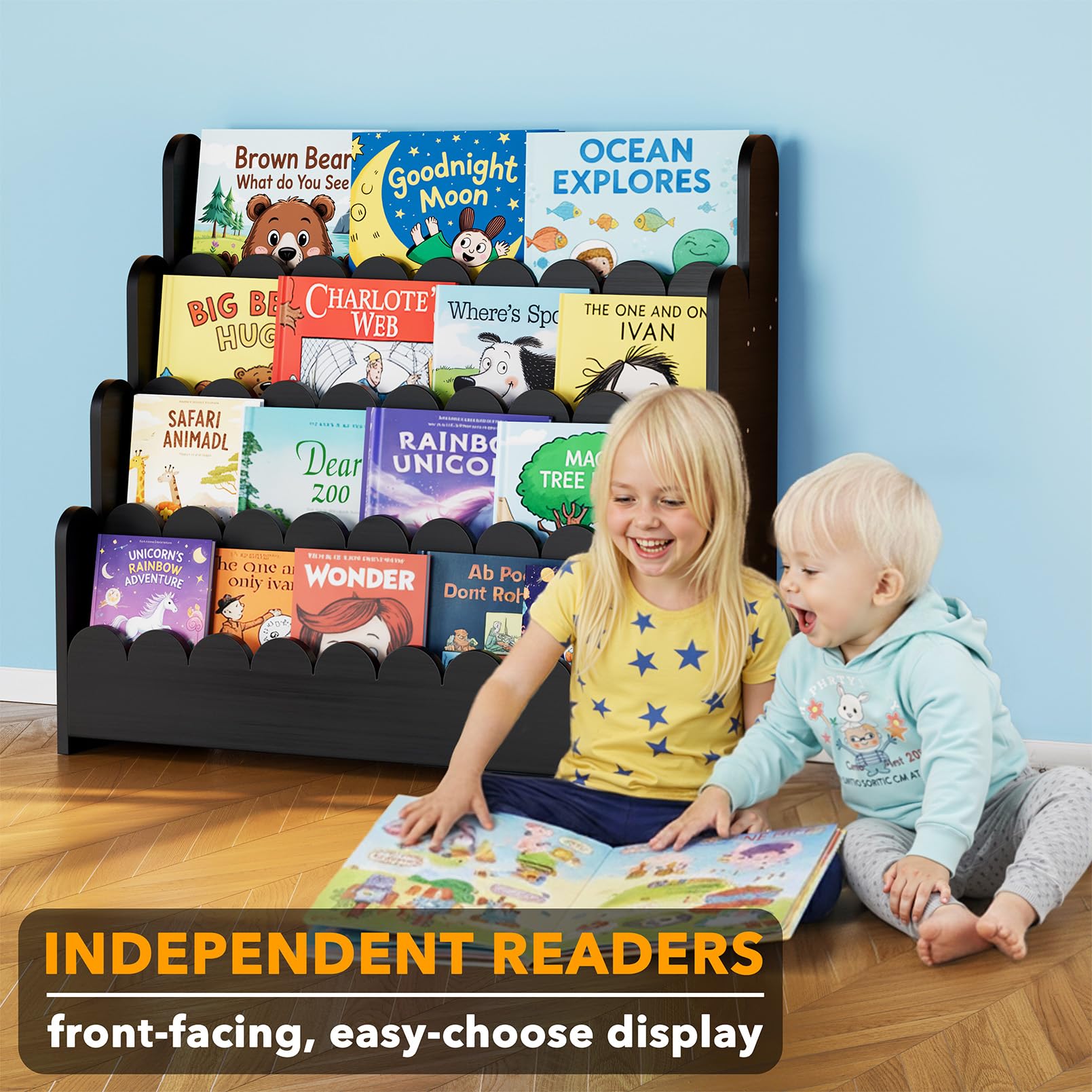 This Montessori-inspired bookshelf features an elegant scalloped design with four front-facing tiers that encourage independent learning and reading habits. The accessible low-height construction allows toddlers to easily select and return books on their own, fostering early literacy development and organizational skills.