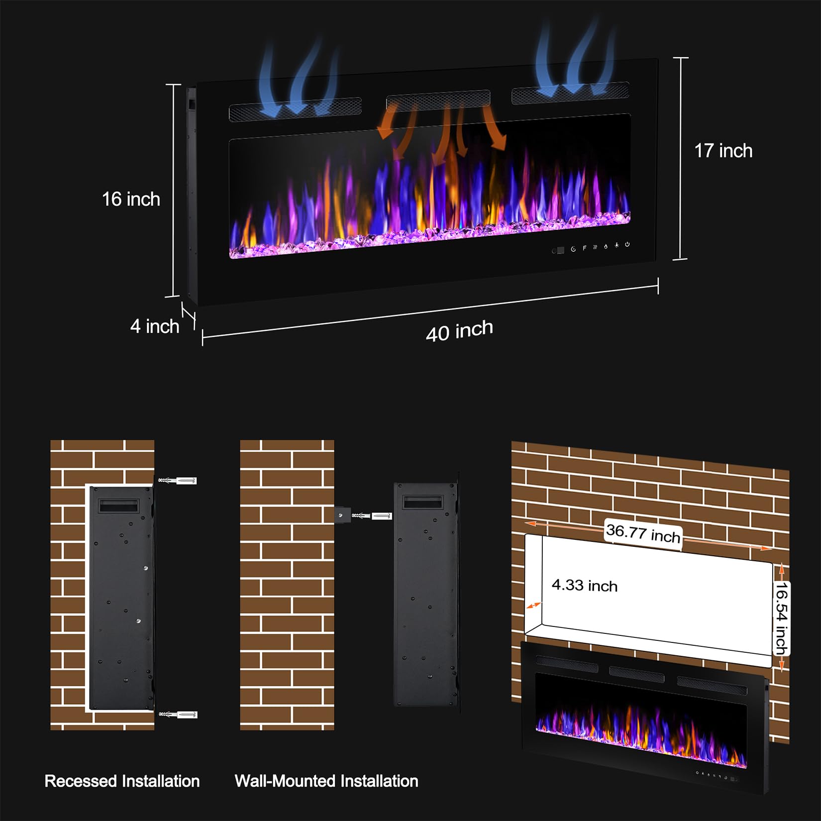 40" Electric Fireplace Wall Mounted Recessed with Remote Control