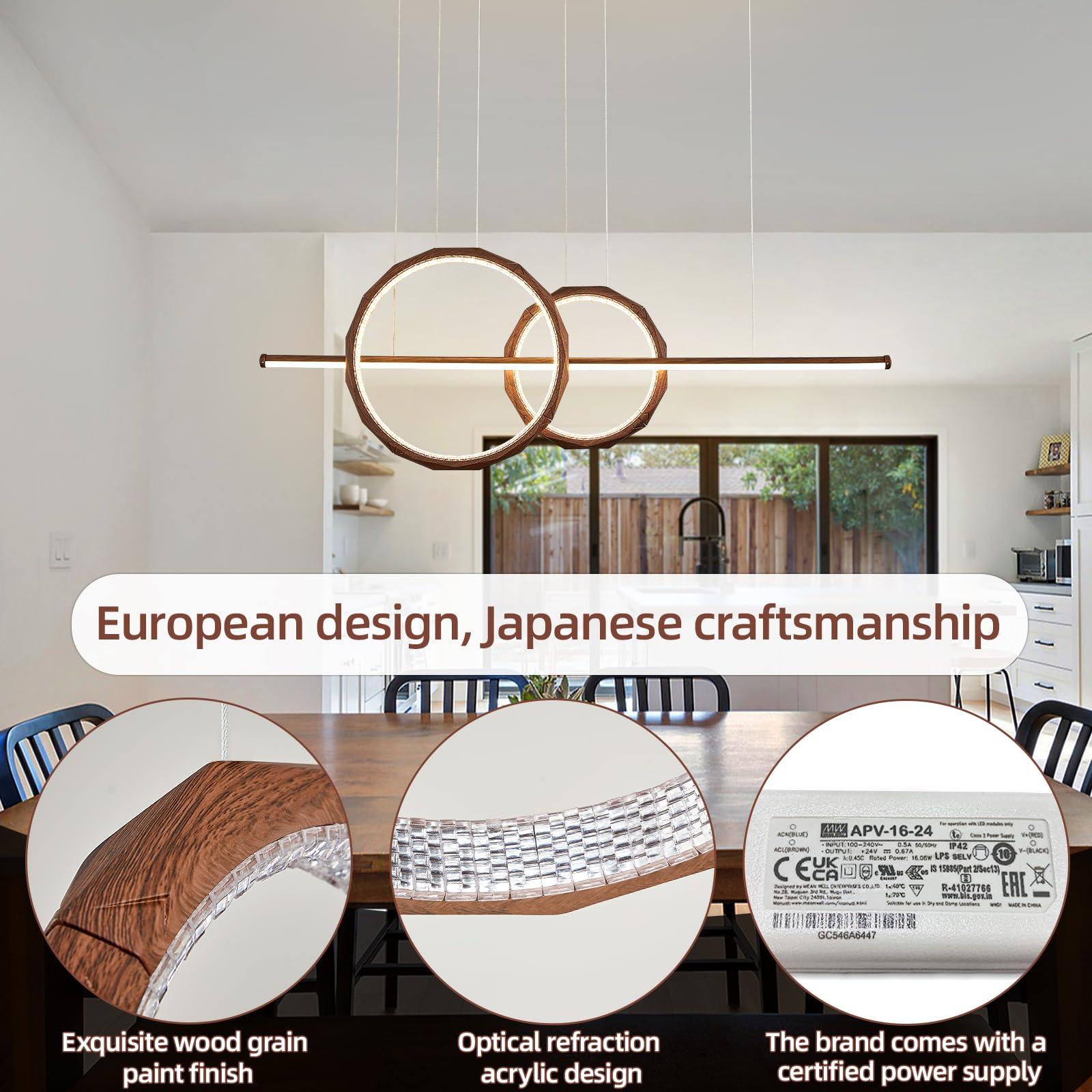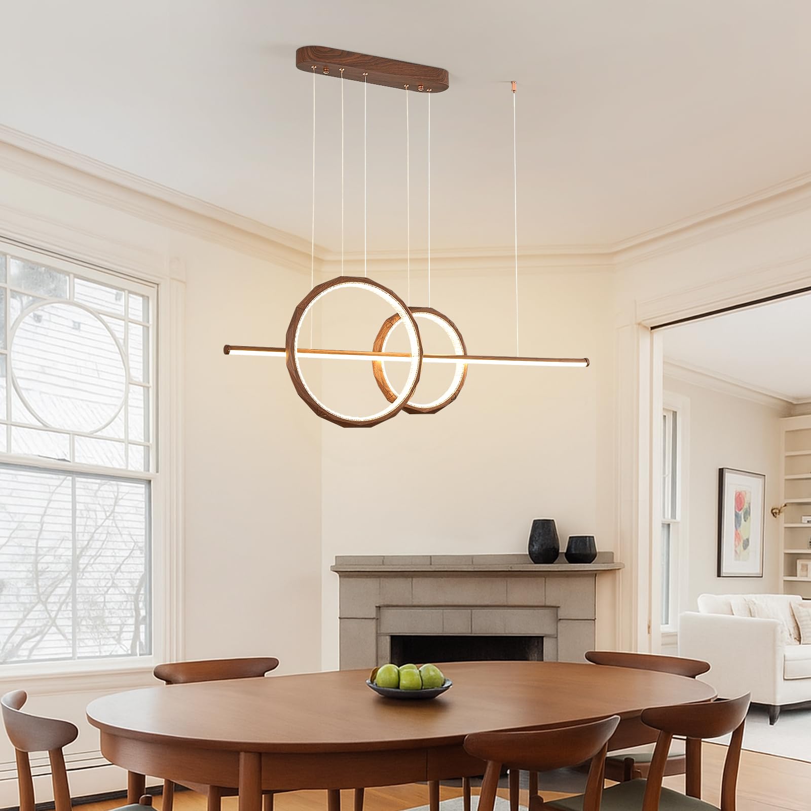 Elevate your dining space with this stunning farmhouse pendant light featuring a warm walnut wood finish and double multi-faceted metal ring design. Perfect for creating ambient lighting over kitchen islands, dining tables, coffee bars, and counters.