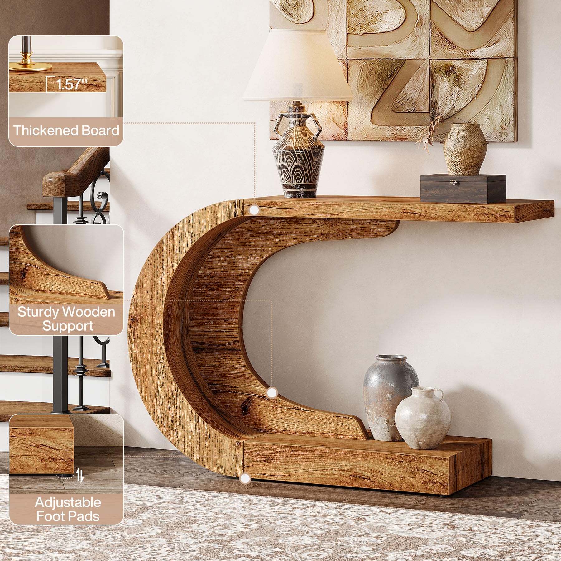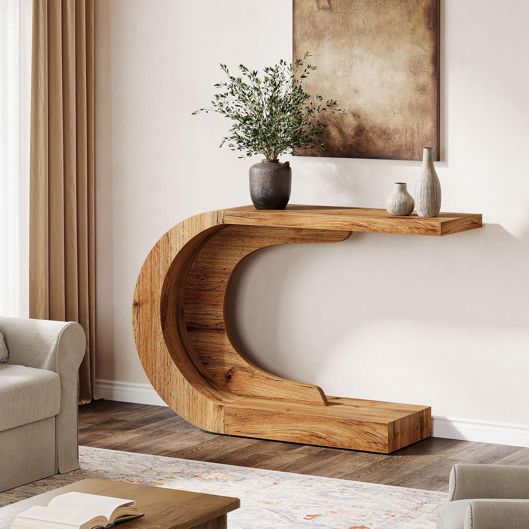 This elegant console table combines timeless mid-century design with functional versatility. The distinctive C-shaped silhouette creates a striking visual statement while maximizing space efficiency in your entryway, living room, or foyer.