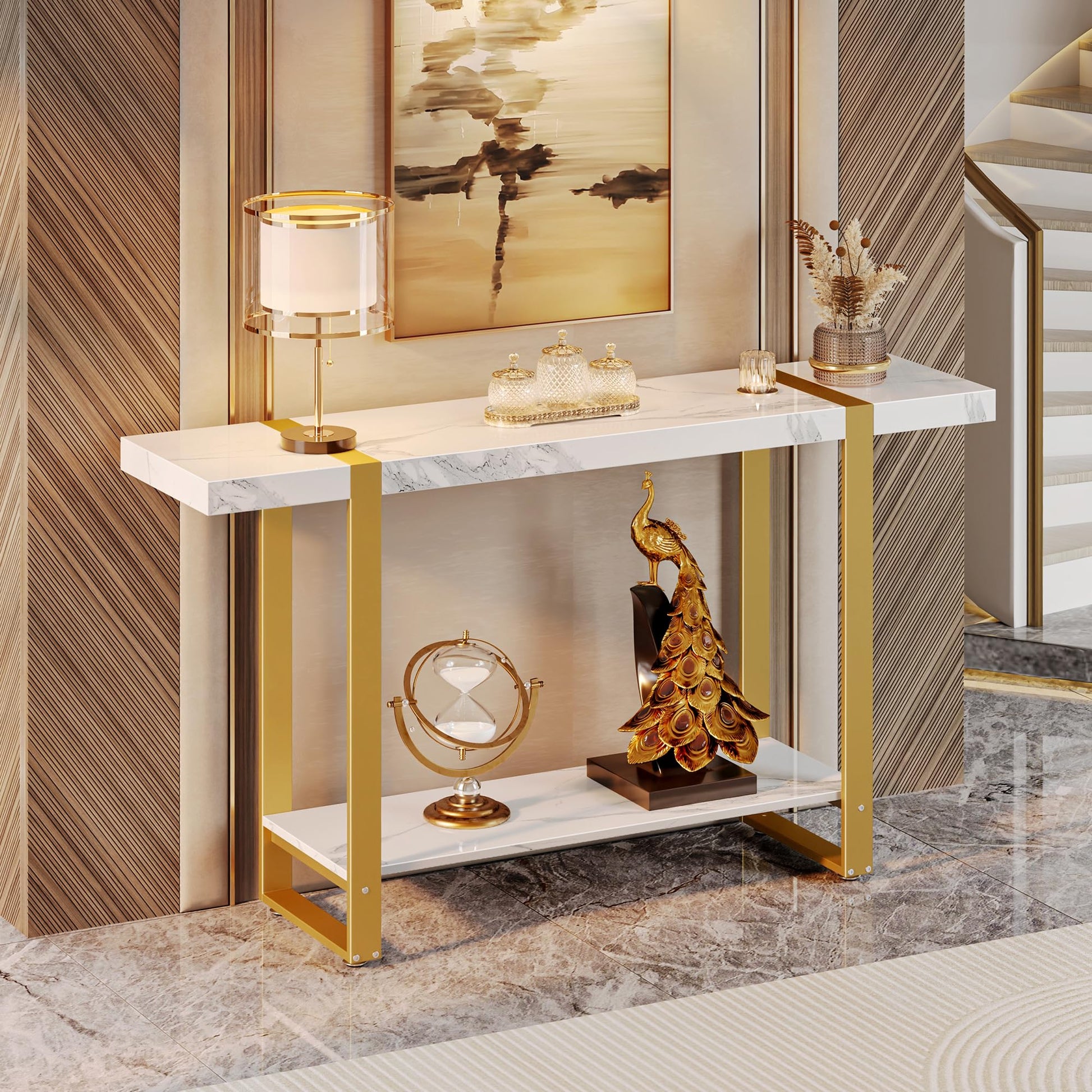 This modern console table features a unique T-shaped gold metal frame paired with a white faux marble top, delivering a clean, contemporary aesthetic that fits effortlessly into both modern and transitional homes.