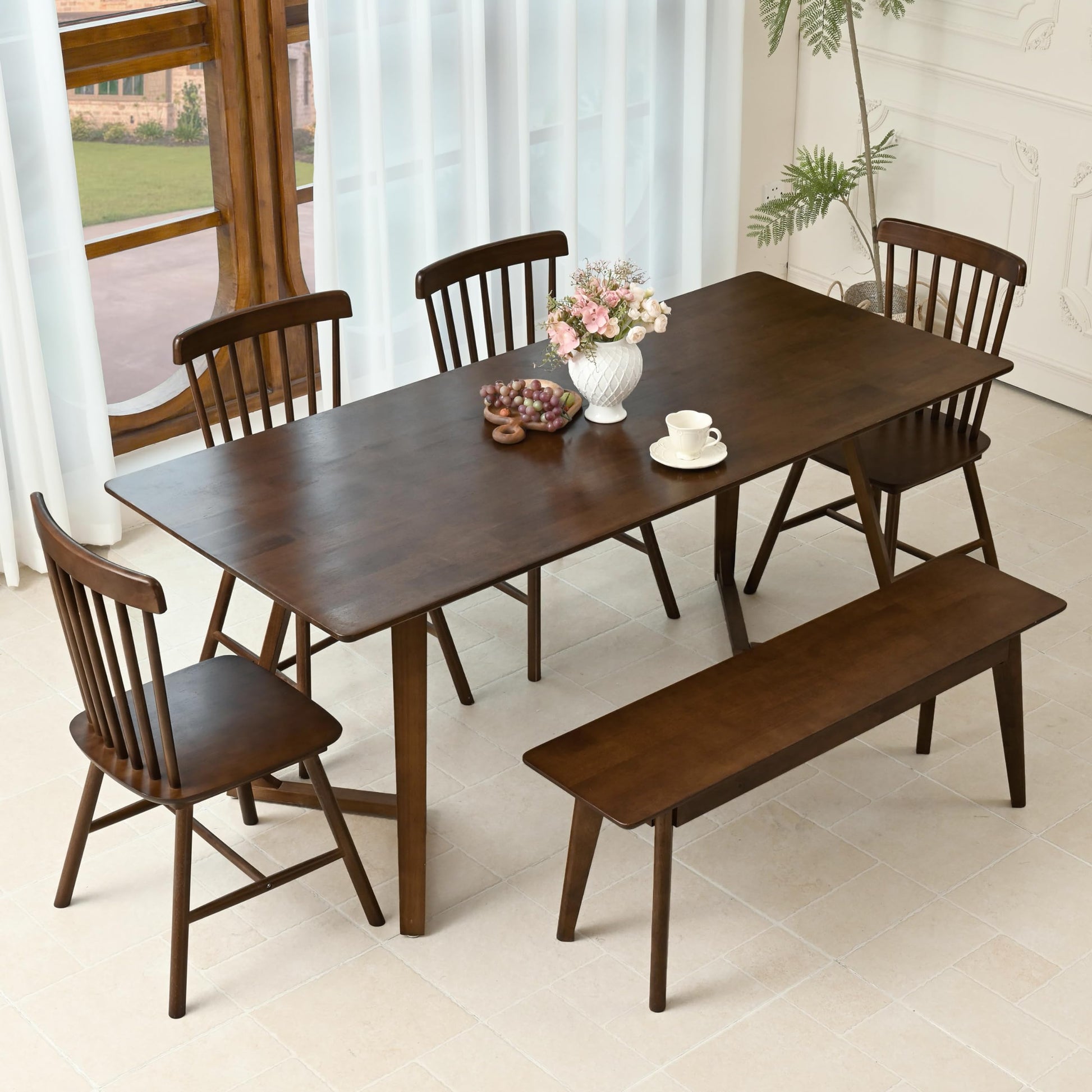 This solid wood dining bench combines midcentury design with practical functionality, perfect for dining rooms, kitchens, bedrooms, entryways, and living spaces. Crafted from premium walnut wood, this 47-inch bench offers durable construction and timeless aesthetic appeal.