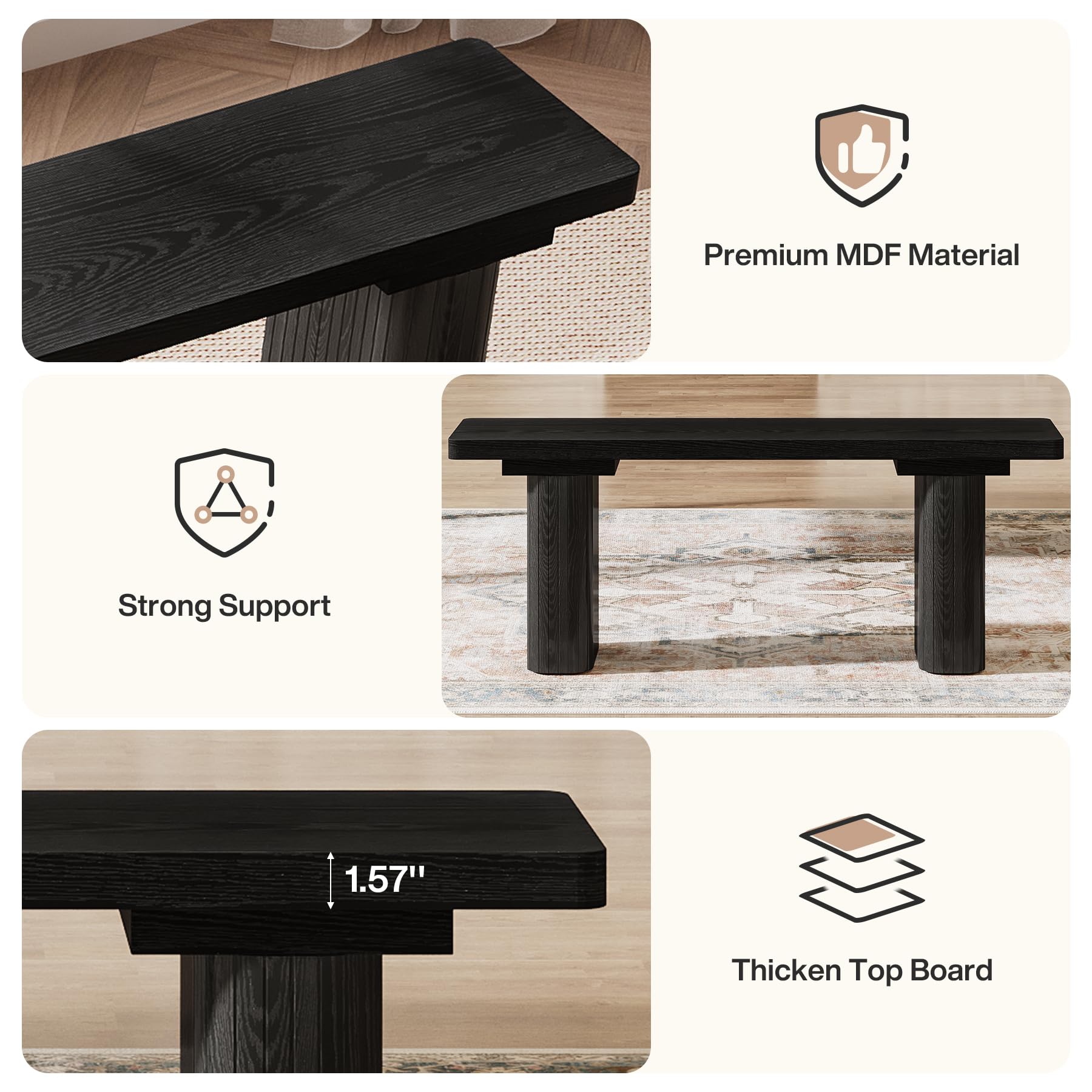 Built with two thick 5.12-inch legs and high-quality MDF, this dining room bench stands firm like a rooted tree, supporting up to 300 lb. Its smooth surface wipes clean in seconds, combining strength and effortless upkeep.