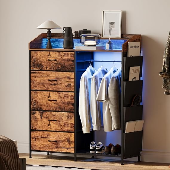 This versatile 2-in-1 dresser combines ample storage with modern functionality, featuring 5 fabric drawers and a built-in hanging rack. The integrated RGB LED lighting system offers 20 color options, 6 dynamic modes, and adjustable brightness levels to create the perfect ambiance in any room. A convenient charging station keeps your devices powered and within reach.