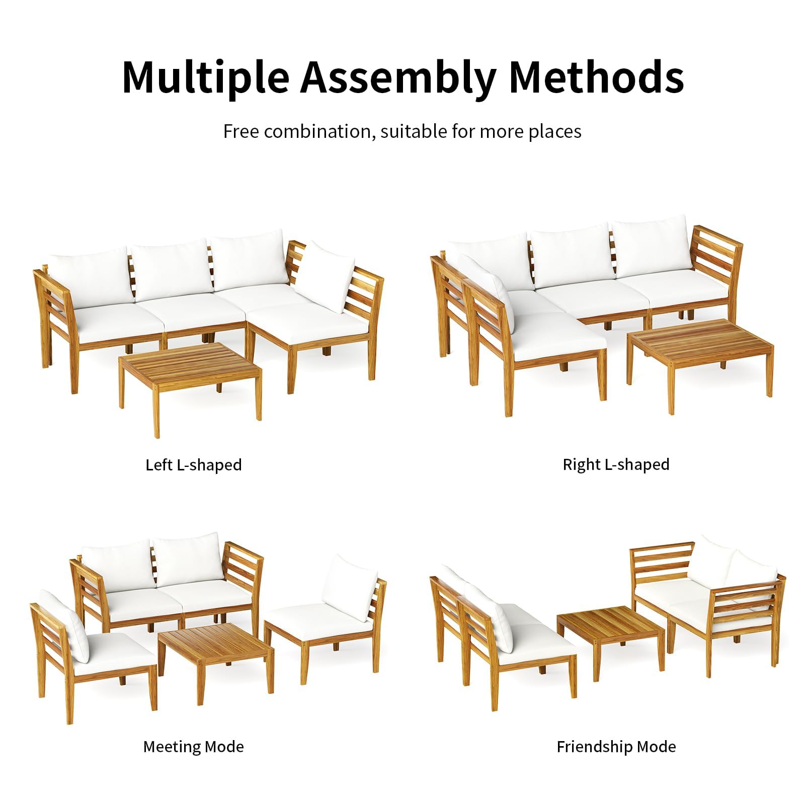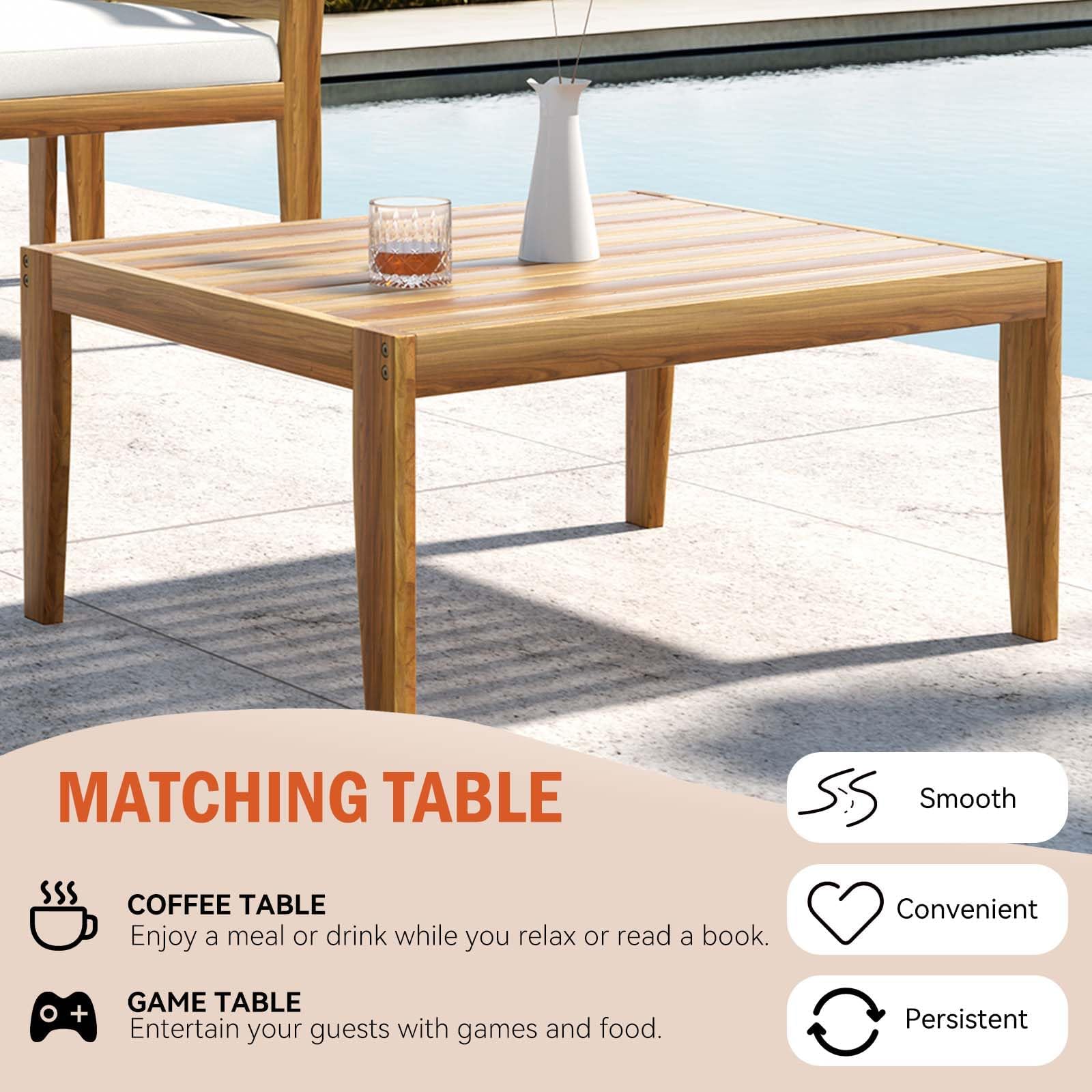 This complete outdoor patio conversation set combines natural acacia wood construction with weather-resistant comfort, creating an inviting space for relaxation and entertaining. The set includes a loveseat, two single chairs, a coffee table, and matching waterproof cushions.