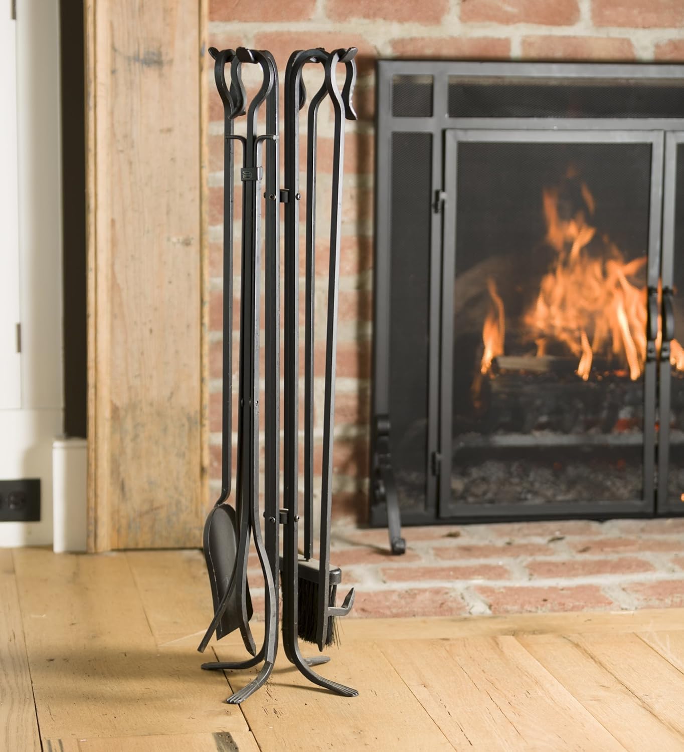 - Black finish complements any fireplace décor