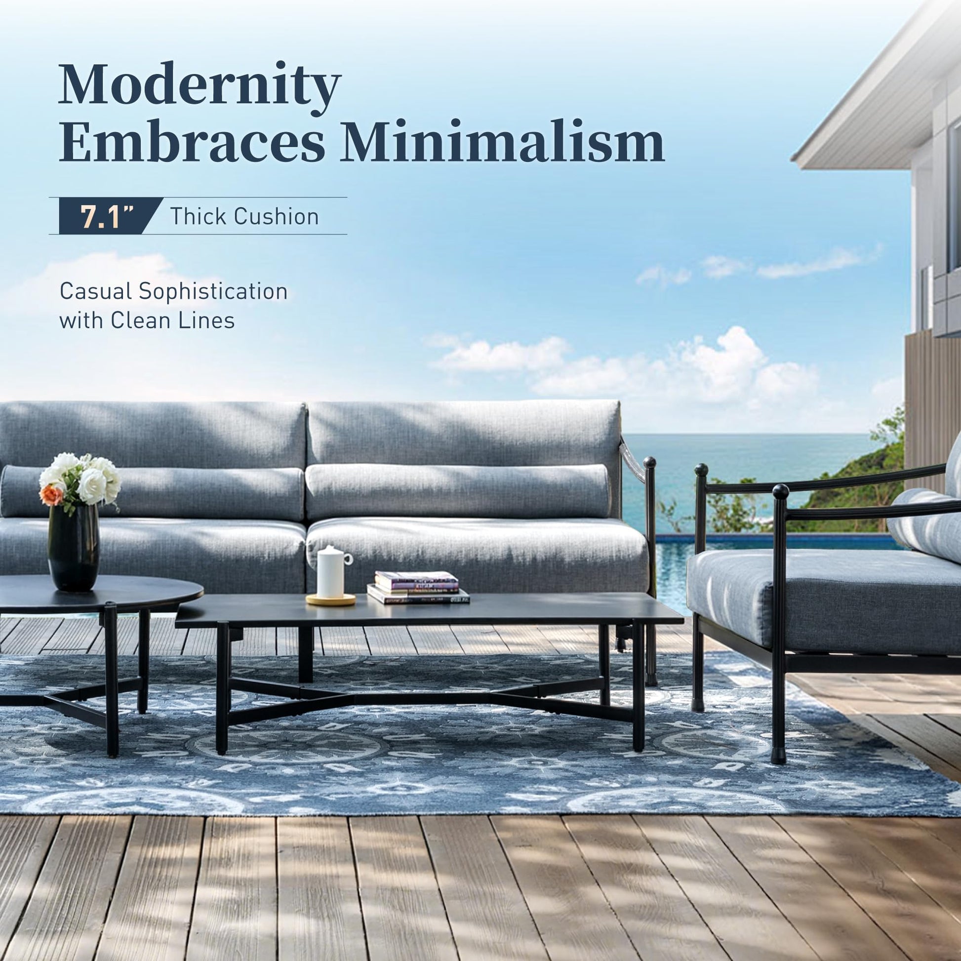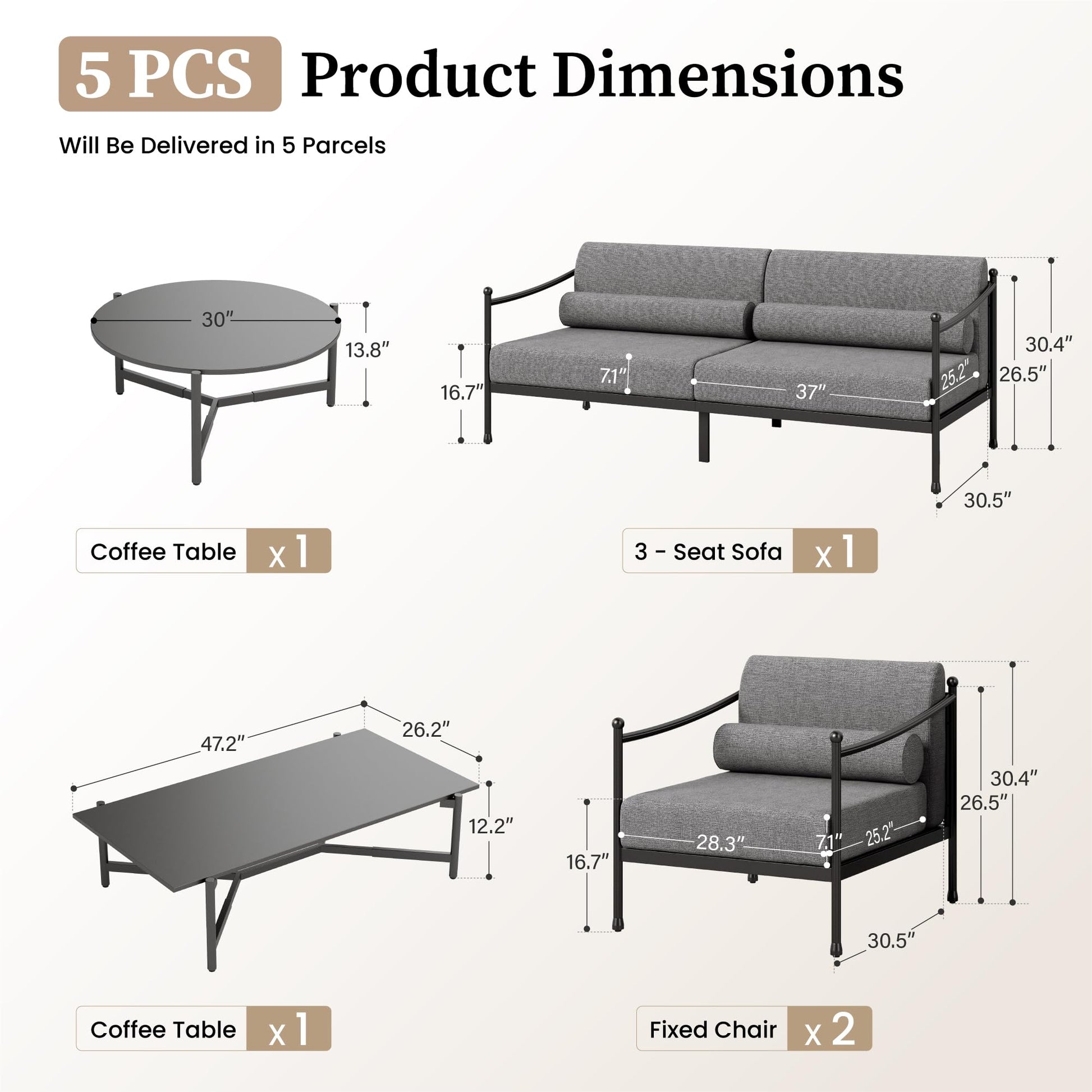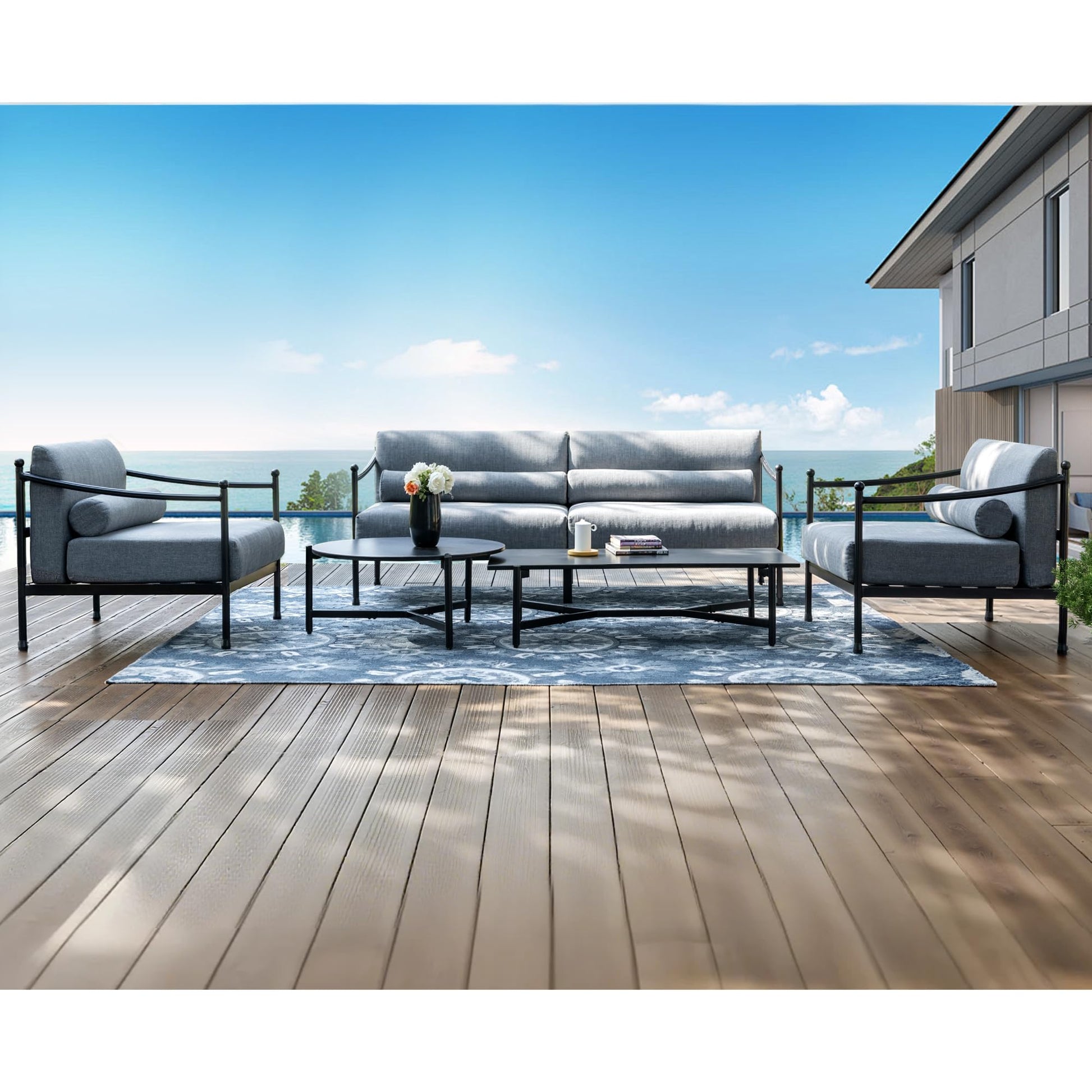 Transform your outdoor space with this complete 5-piece patio furniture set. Designed for durability and comfort, this set includes a 3-seater sofa, 2 single chairs, and nesting tables with extra-thick cushions.