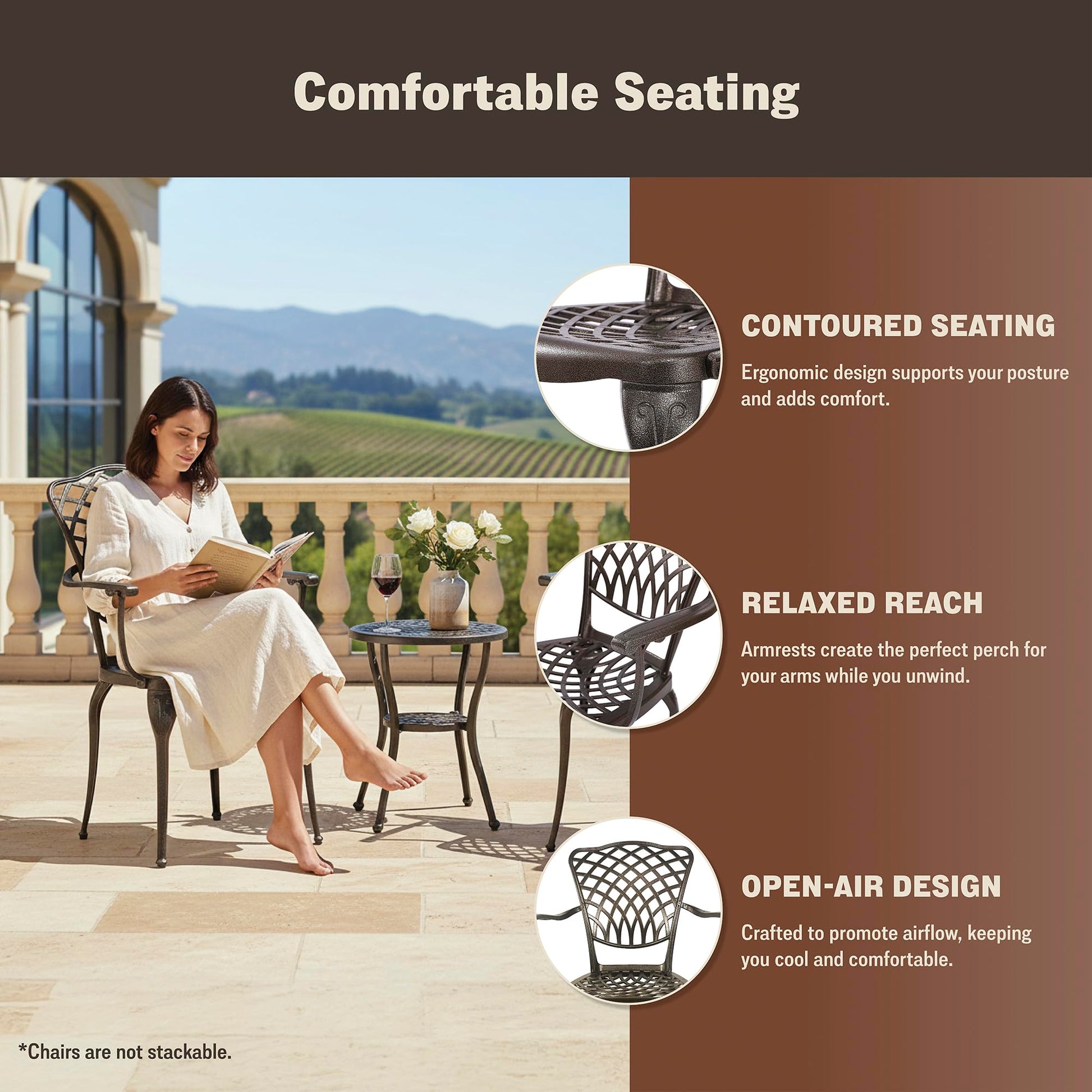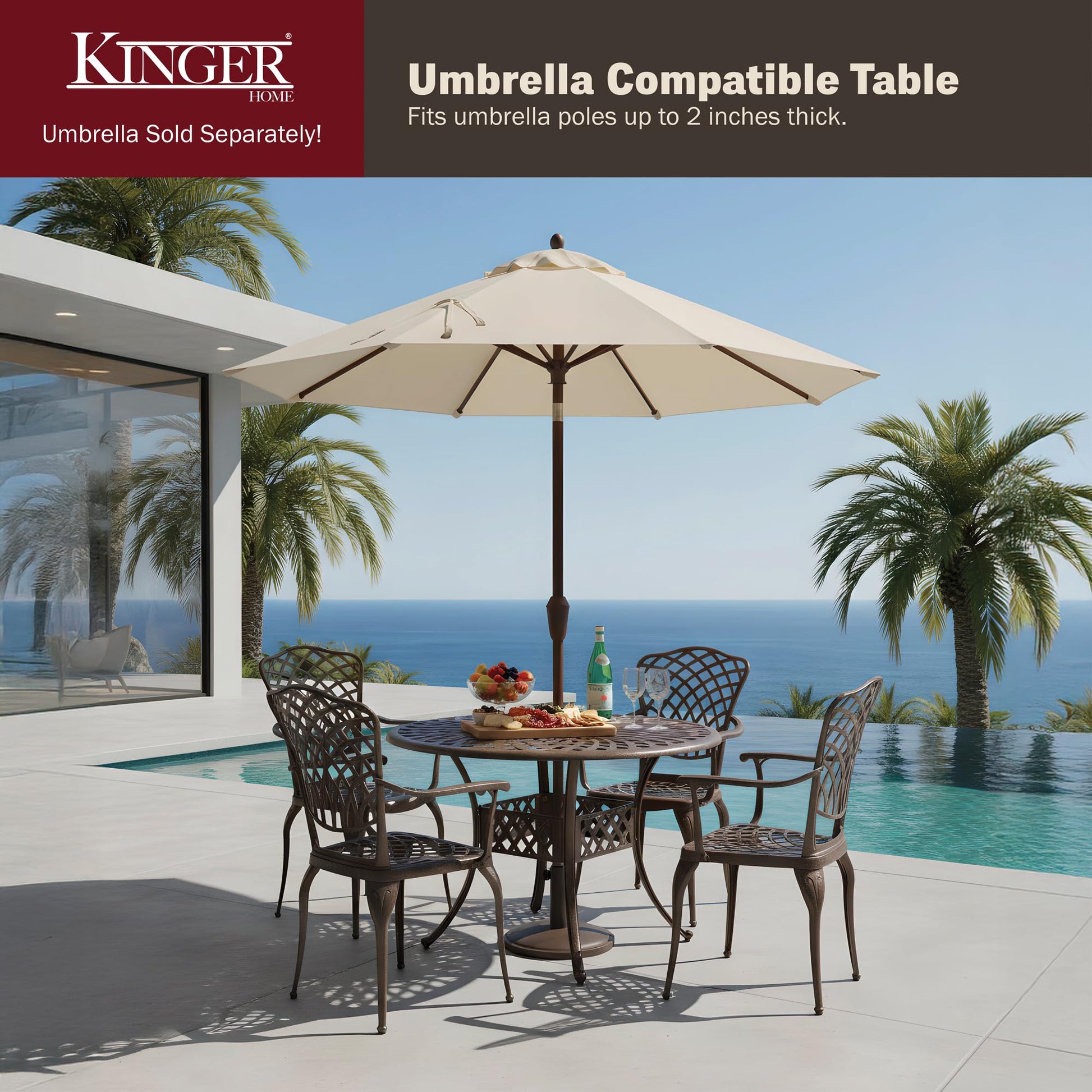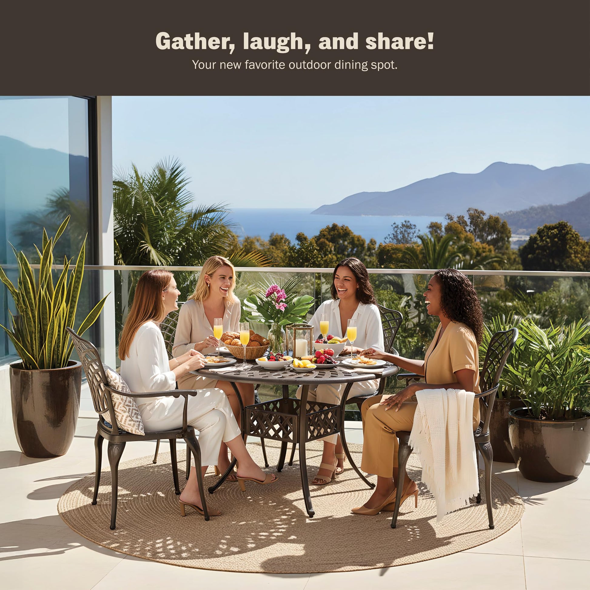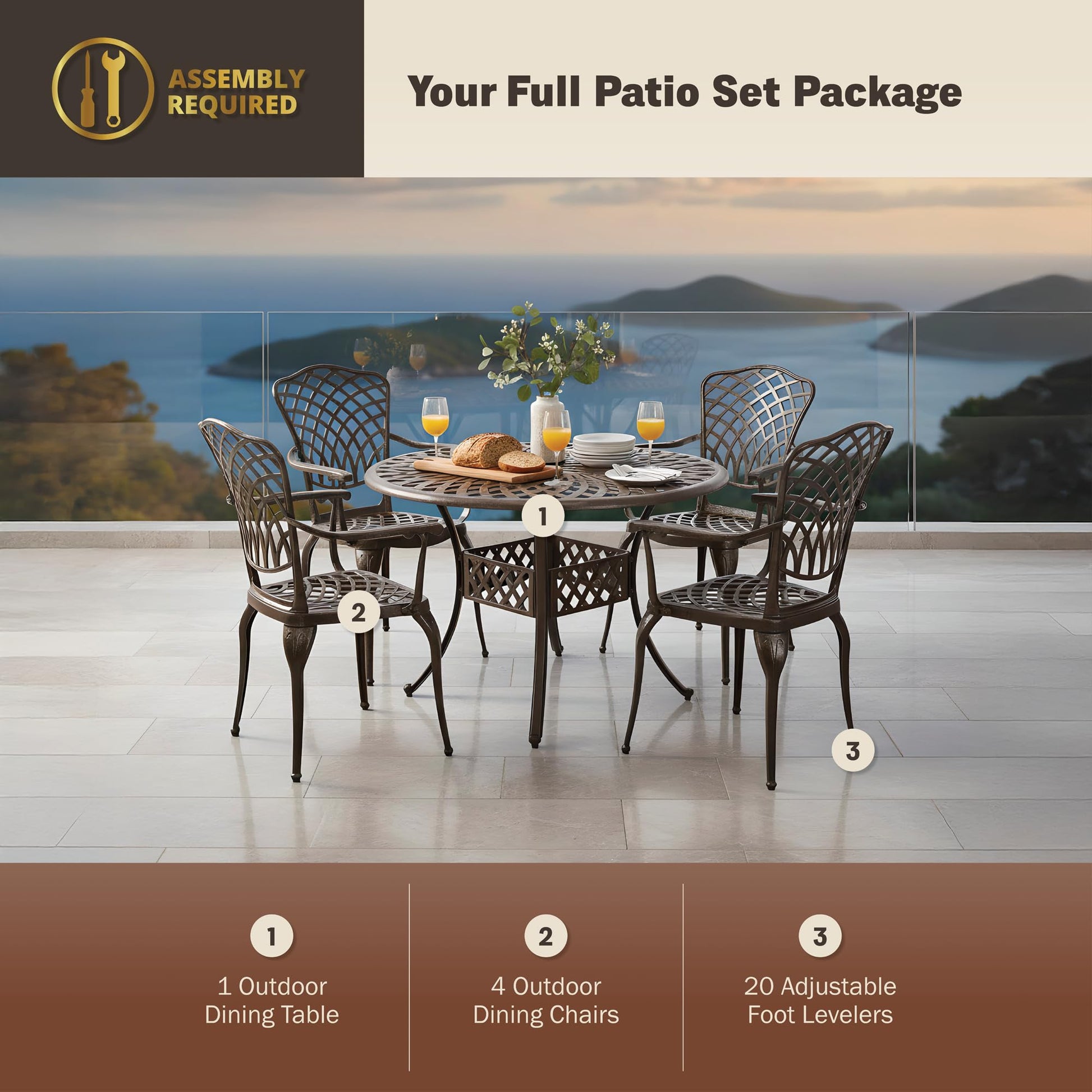 Transform your outdoor space with this elegant 5-piece dining set, crafted from durable cast aluminum with a sophisticated bronze finish. This complete patio furniture collection includes one round dining table and four matching chairs, designed to withstand the elements while providing comfortable seating for family gatherings and outdoor entertaining.