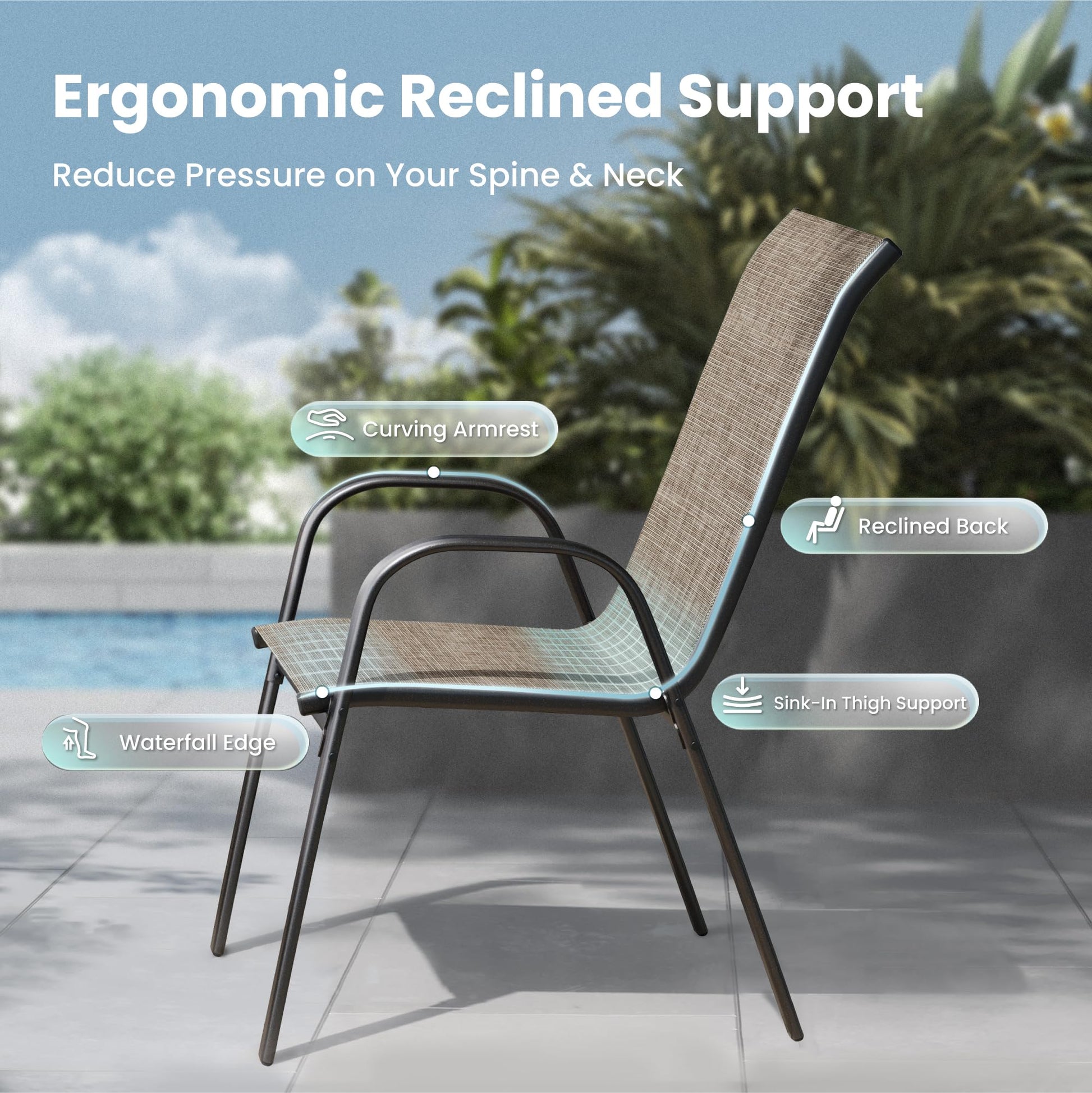 - Premium Textilene Fabric: High-density textilene mesh blended with olefin provides superior comfort, breathability, and durability in all weather conditions