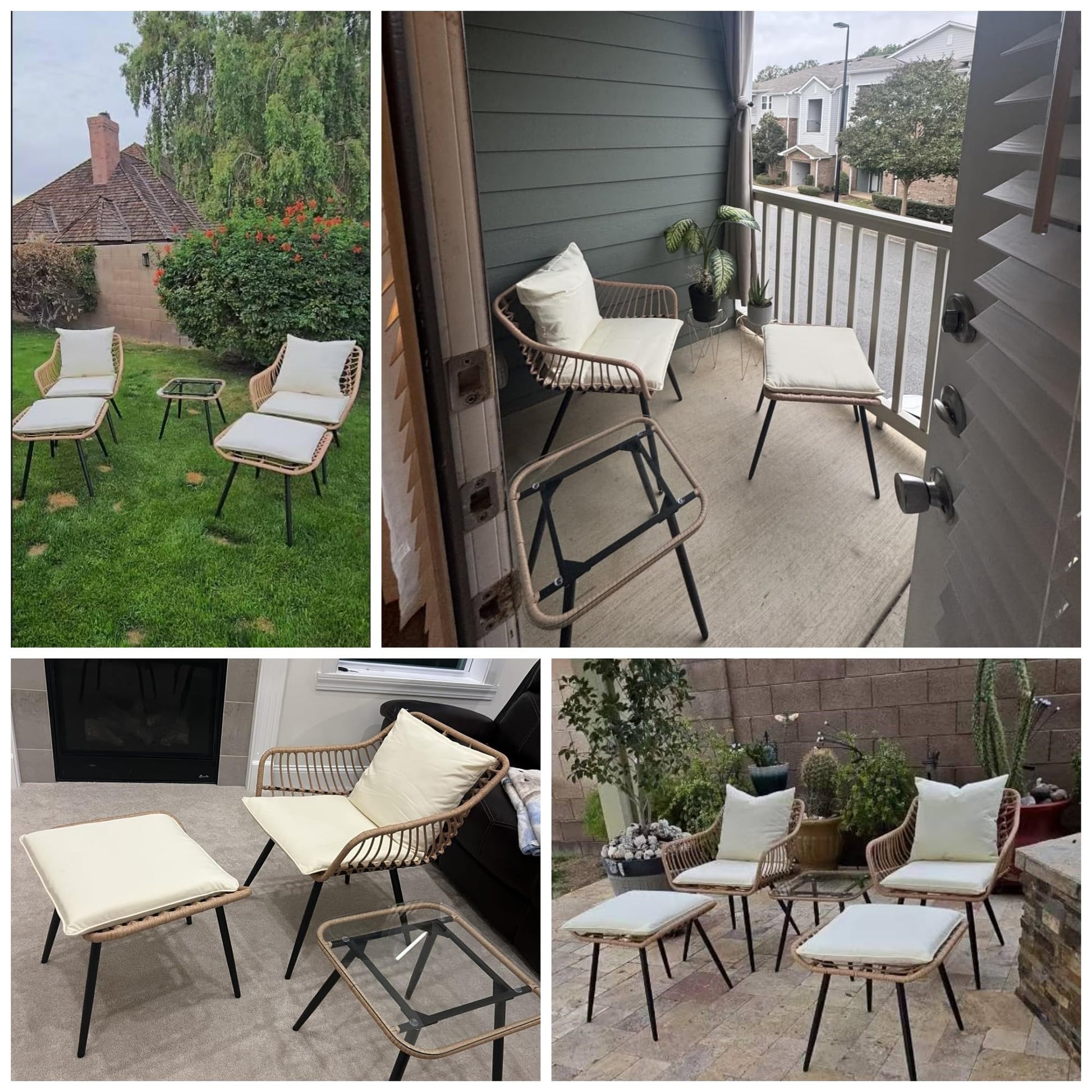 Transform your outdoor space with this complete 5-piece patio furniture set, designed for comfort and durability in all weather conditions. This versatile bistro set includes two wicker chairs, two ottomans, and a coffee table, perfect for creating an inviting conversation area on your balcony, porch, deck, yard, or poolside.