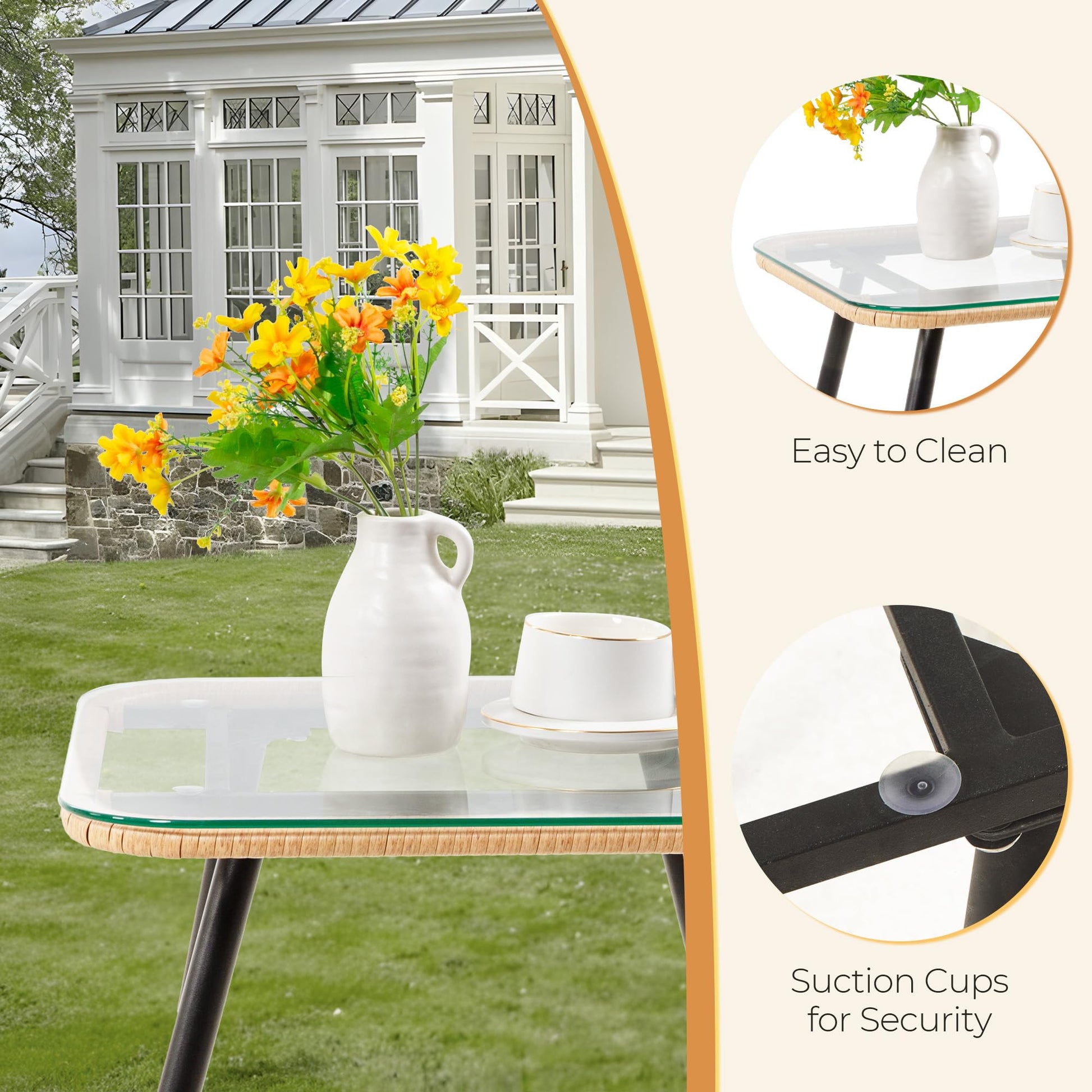 The included coffee table serves as a convenient surface for drinks, snacks, or decorative accents, completing your outdoor entertaining setup. The yellow and beige color scheme adds warmth and sophistication to any outdoor setting.