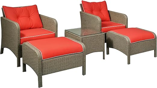 Transform your outdoor space with this elegant 5-piece rattan wicker conversation set. Designed for comfort and durability, this complete patio furniture collection includes 2 cushioned lounge chairs, 2 matching ottomans, and a tempered glass top coffee table—everything you need for relaxing outdoor entertaining.