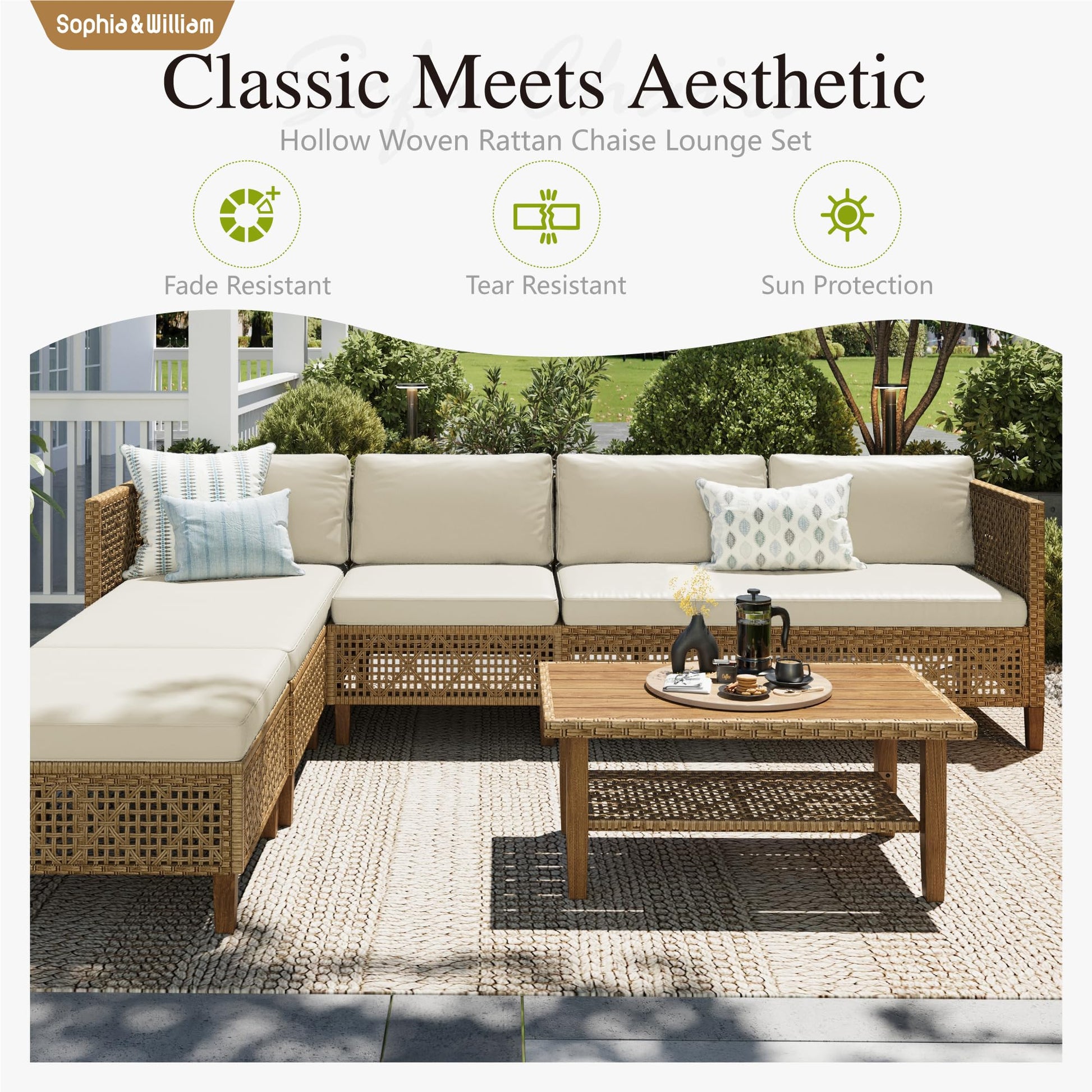 Transform your outdoor space with this elegant 5-piece wicker patio furniture set. Featuring an L-shaped sectional design with plush cushions, a matching ottoman, and an acacia wood coffee table, this conversation set combines bohemian style with all-weather durability.