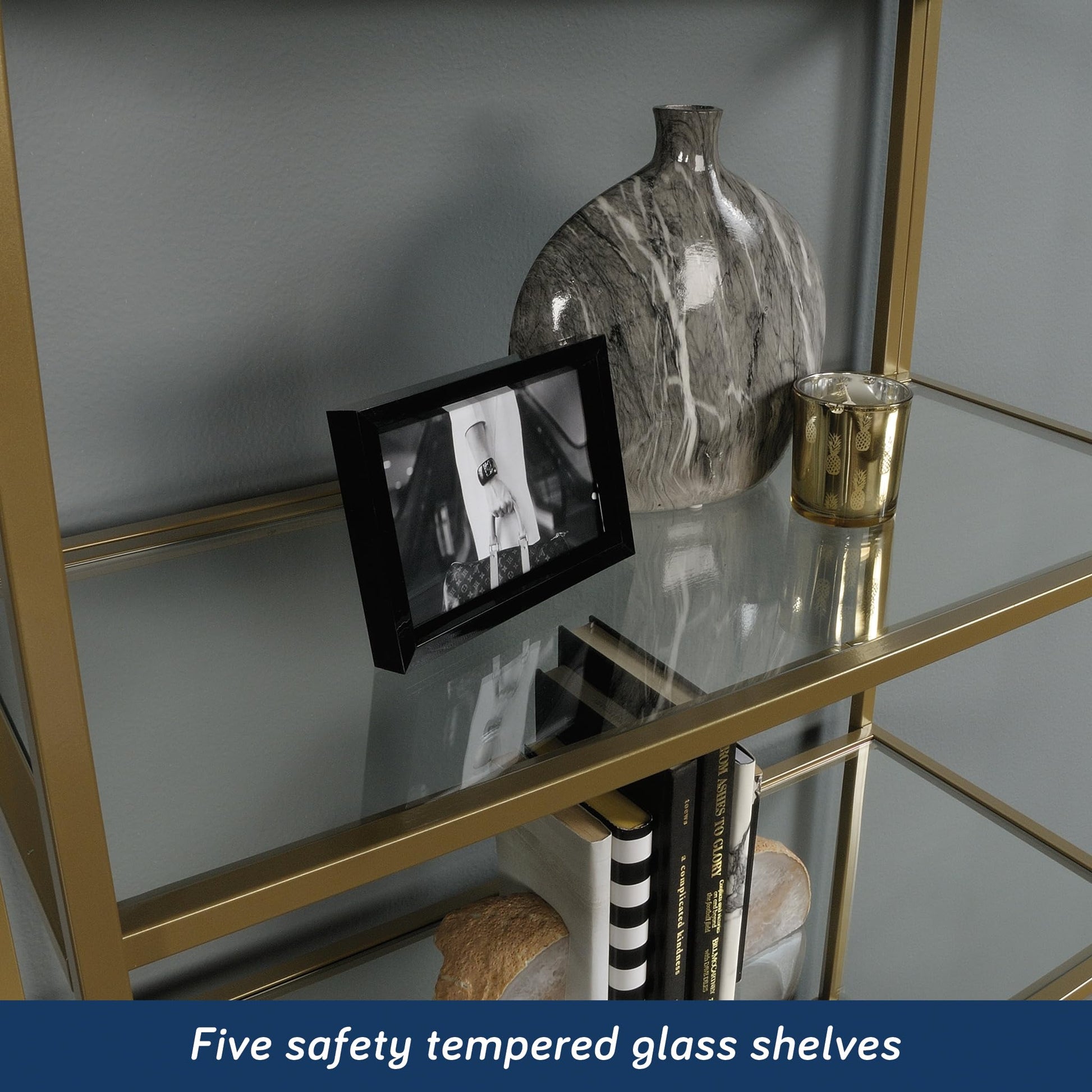 Elevate your home's style with this modern tall bookcase featuring five spacious, safety-tempered glass shelves. Perfect for displaying books, collectibles, or essentials in any room. The Satin Gold finish on the sturdy metal frame brings a touch of elegance and sophistication to your space, whether it's a lively living area or a sleek office.