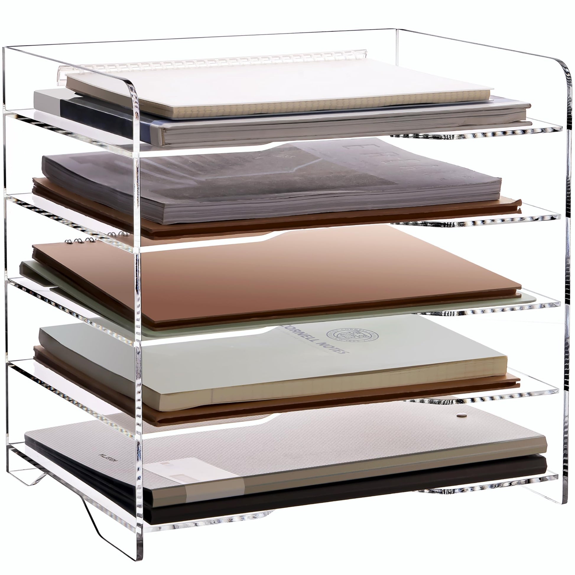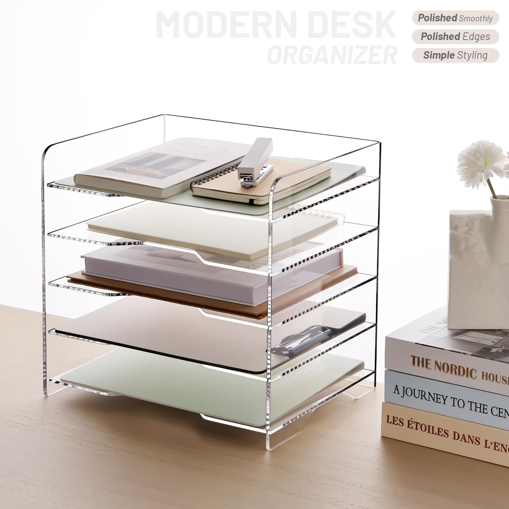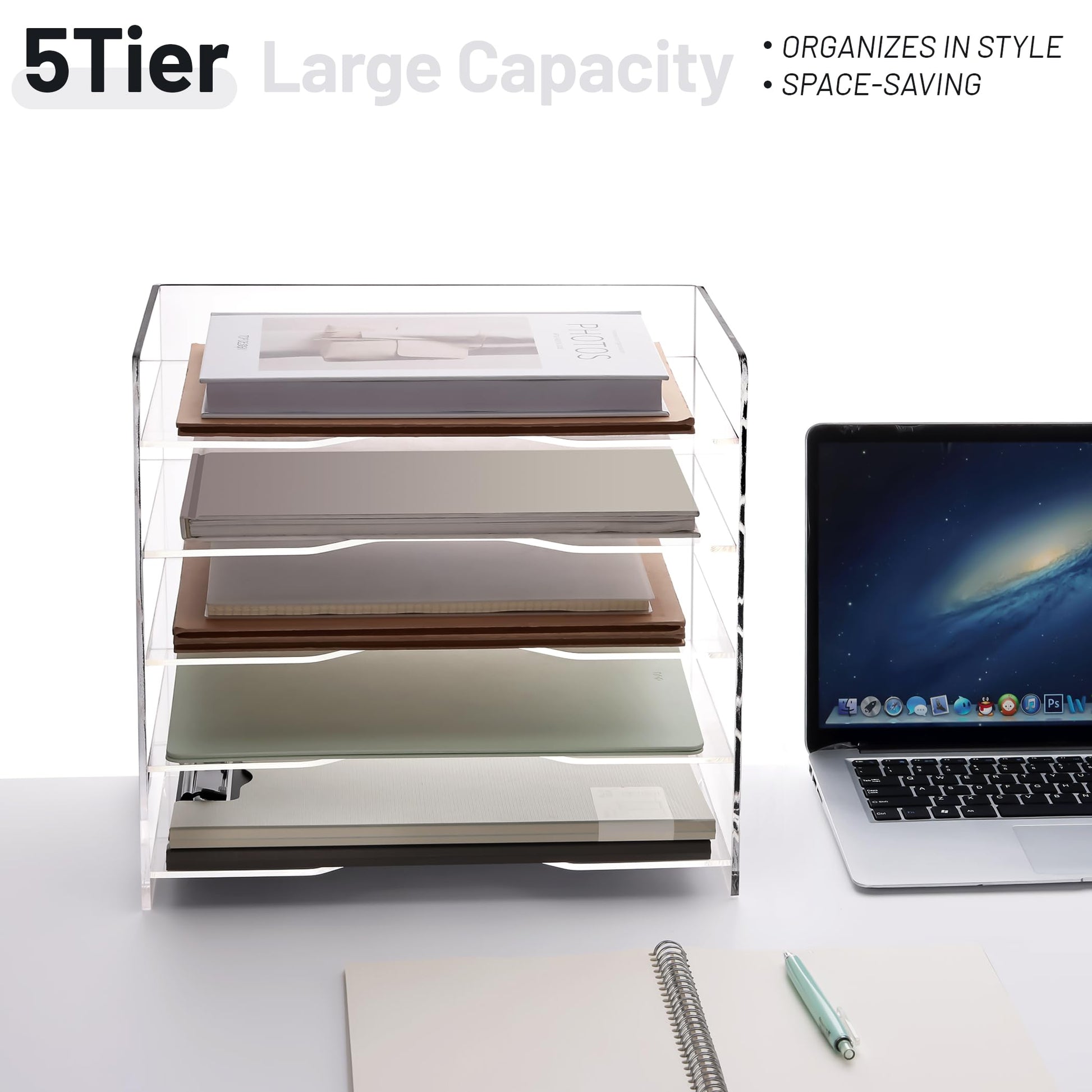 Professional 5-tier acrylic desk file organizer designed to streamline your workspace and keep documents neatly arranged. This clear desk organizer features a built-in handle for easy portability and repositioning.