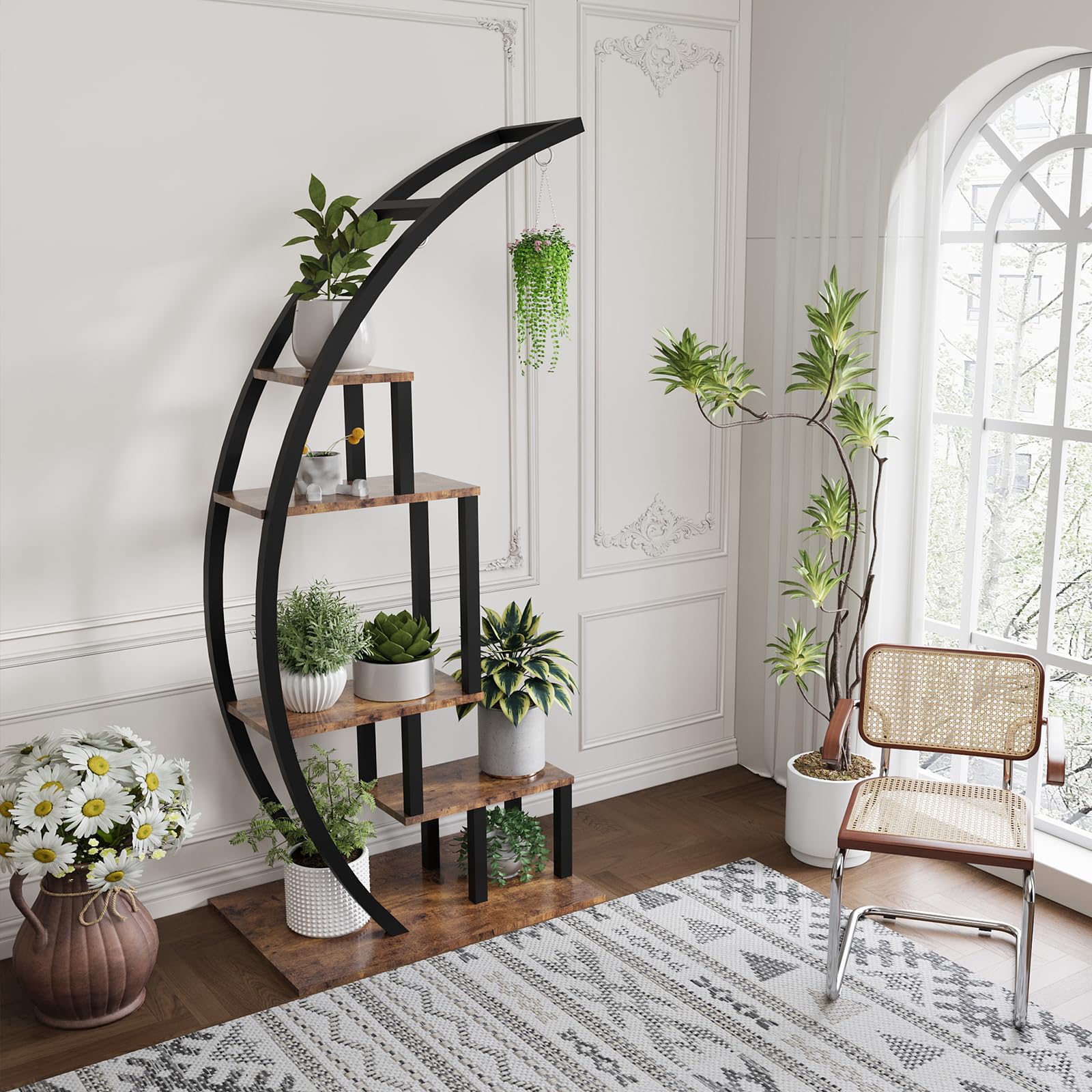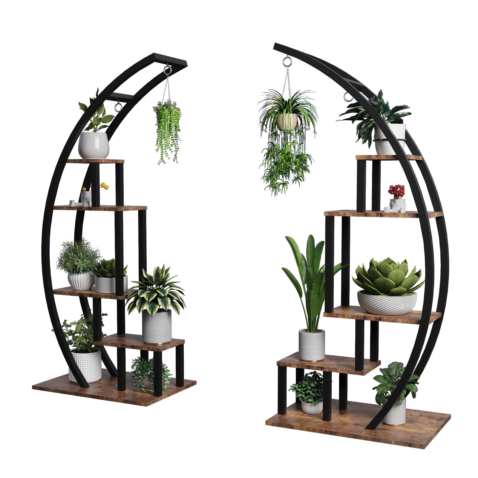 This vintage industrial arc plant stand features a unique curved design with 5 multi-layer tiers, perfect for displaying your favorite potted plants, flowers, and books. The sturdy construction combines durable metal framework with natural wood shelves, creating an eye-catching focal point for any space.