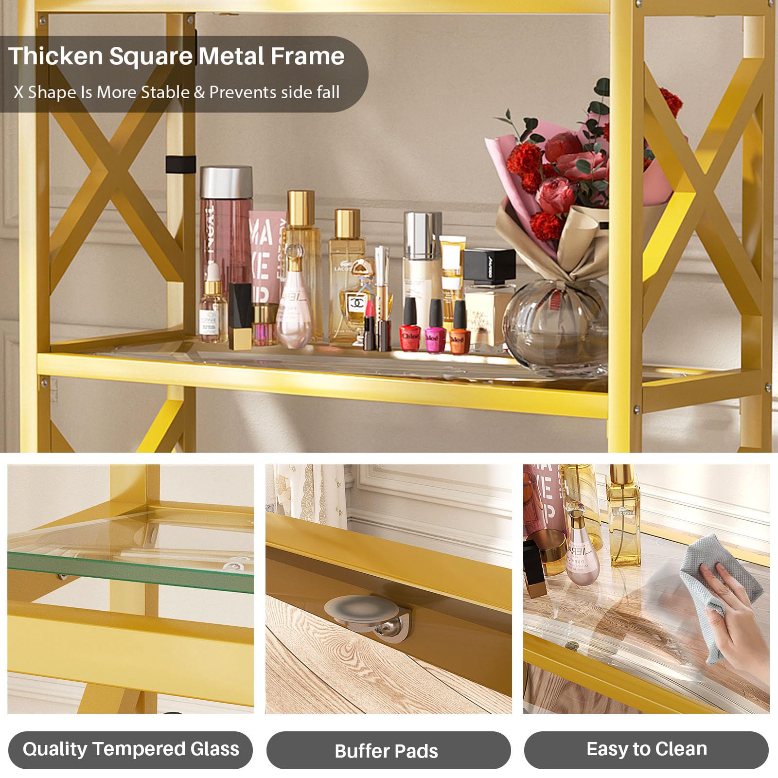 | Material | Stainless Steel Frame, Tempered Glass Shelves |