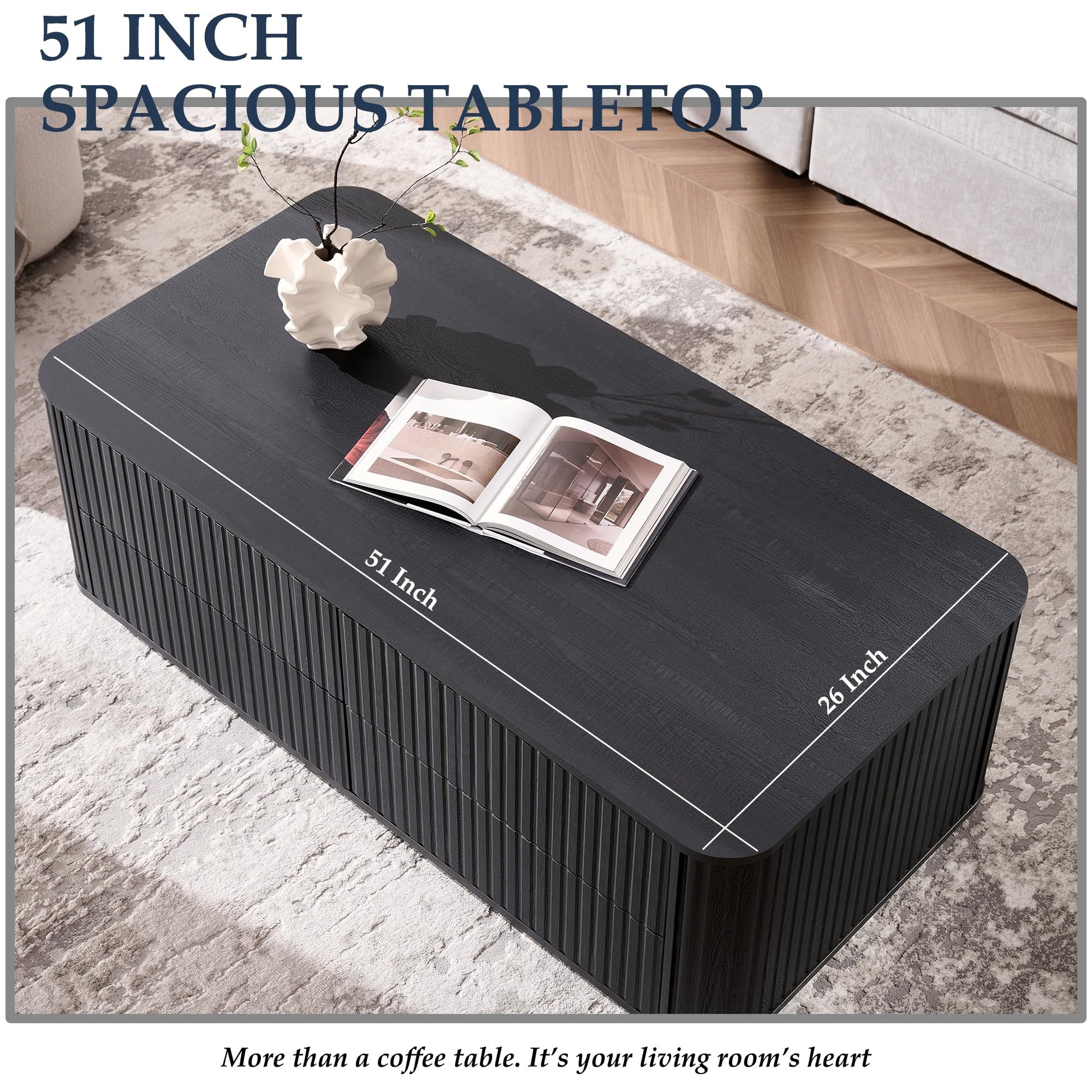 The generous 51-inch wide surface provides ample space for everyday activities—from morning coffee and weekend brunch to family game nights and decorative displays. Four handle-free drawers offer convenient press-to-open storage for remotes, magazines, coasters, toys, and blankets, keeping your living space organized and clutter-free.