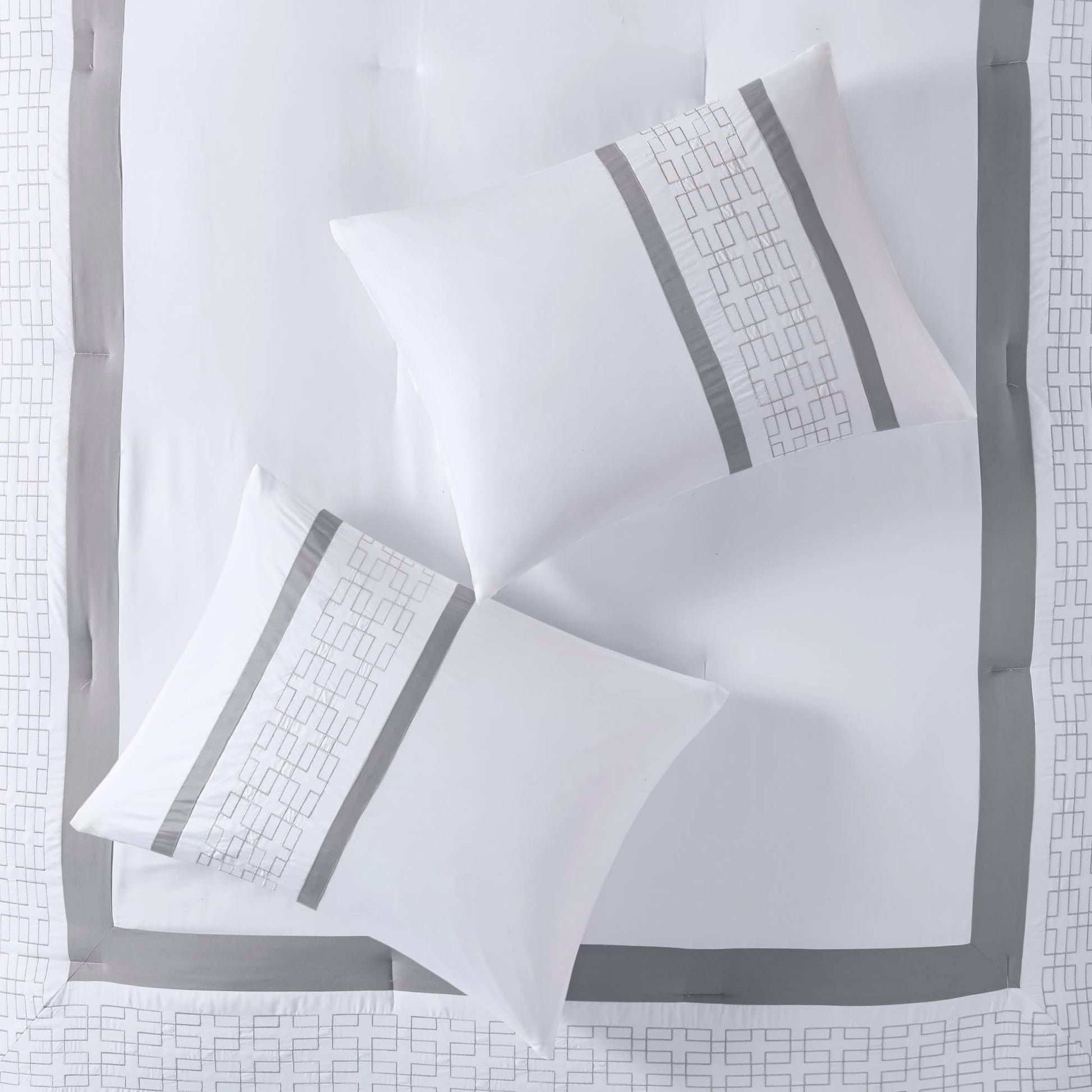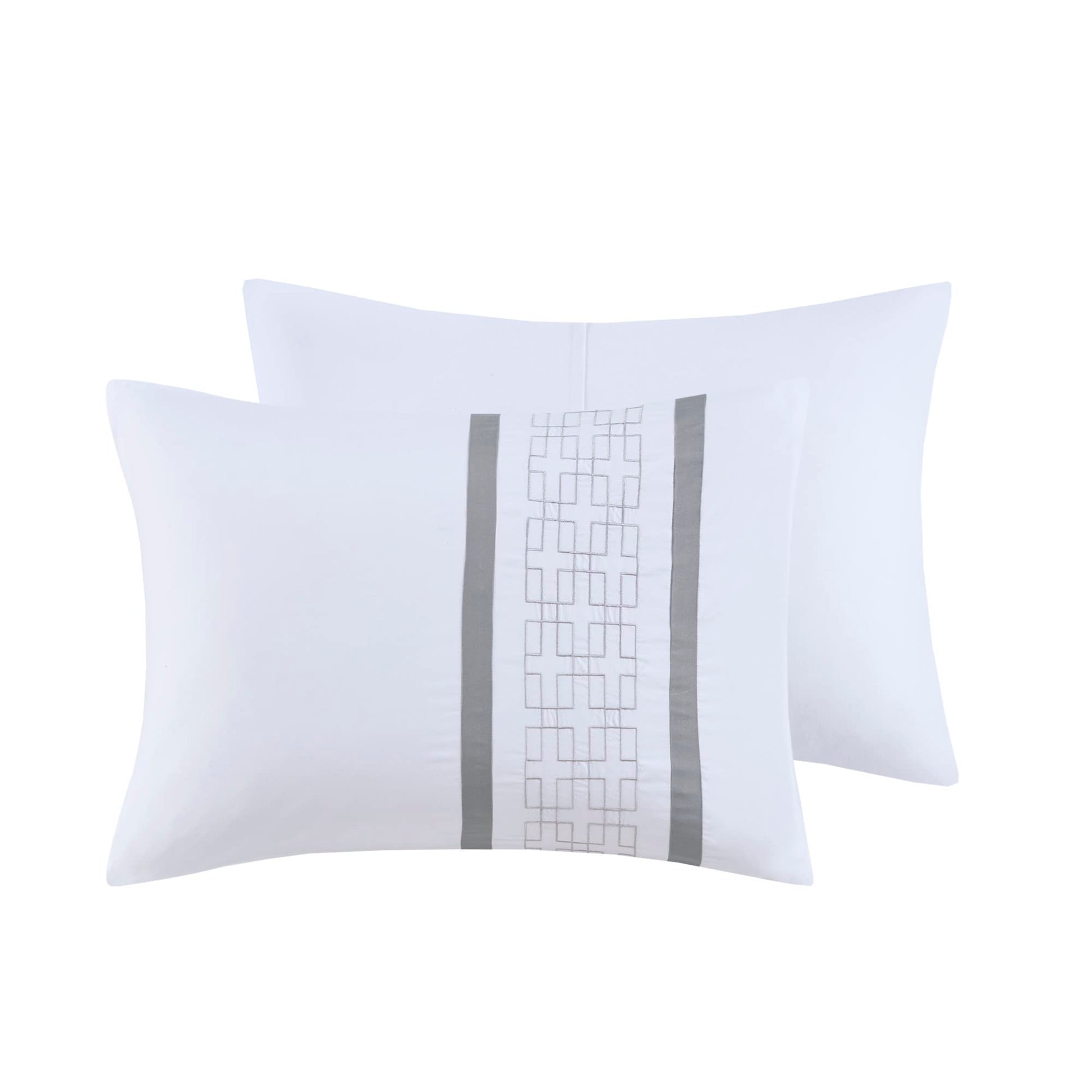 Details: 510 Design presents the Powell 8 Piece Embroidered Comforter Set to elevate your bedroom decor. This hotel style white comforter features an embroidered and pieced border for a sophisticated and elegant design that easily coordinates with your space. The matching pillow shams also flaunt beautiful embroidery details, while the grey Euro shams are accented with graceful white flanges to complete the transitional look. A solid grey bedskirt and 2 decorative pillows with embroidered details add the finishing touches to this hotel style bedding set. Hypoallergenic polyester filling in the comforter and pillows contains no allergens and is treated to be dustproof. Machine washable for easy care, this embroidered comforter set may come in rolled or compressed packing and will need to be fluffed up. Use a steam iron to help remove wrinkles easier.