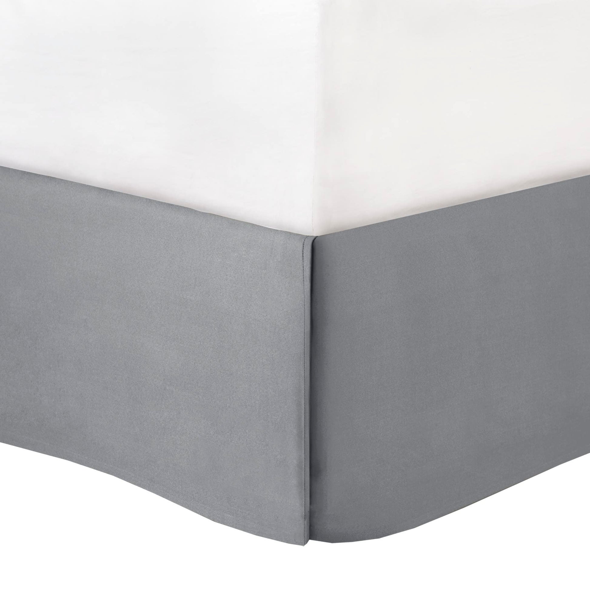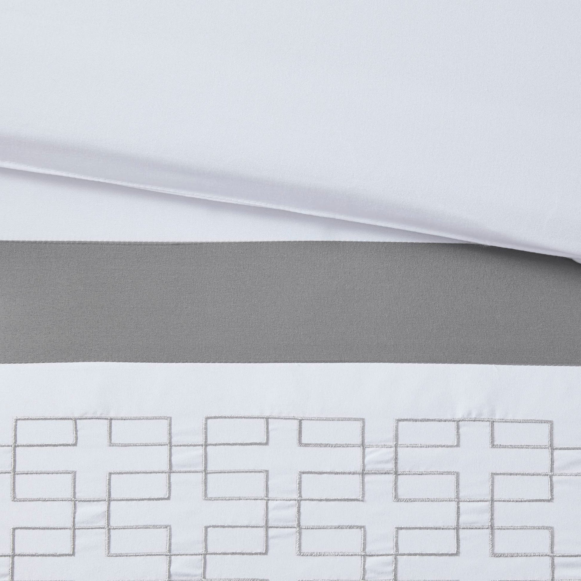 - A solid grey bedskirt and 2 decorative pillows with embroidered details add the finishing touches to this hotel style bedding set.