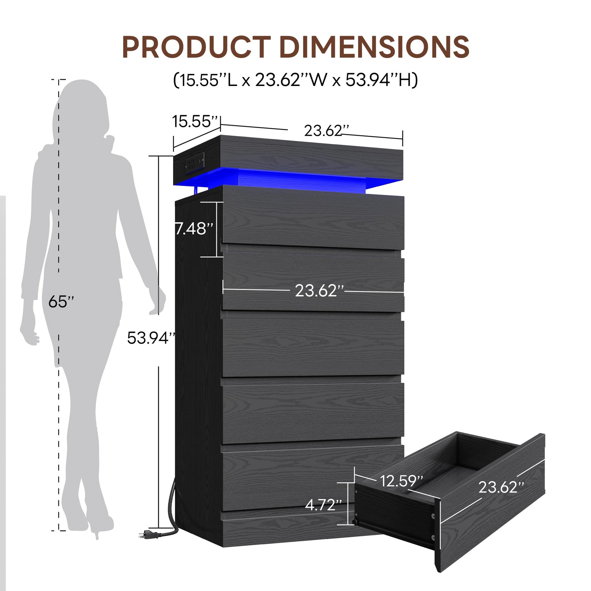 54" Tall 5 Drawer Dresser with LED Light and Power Outlet