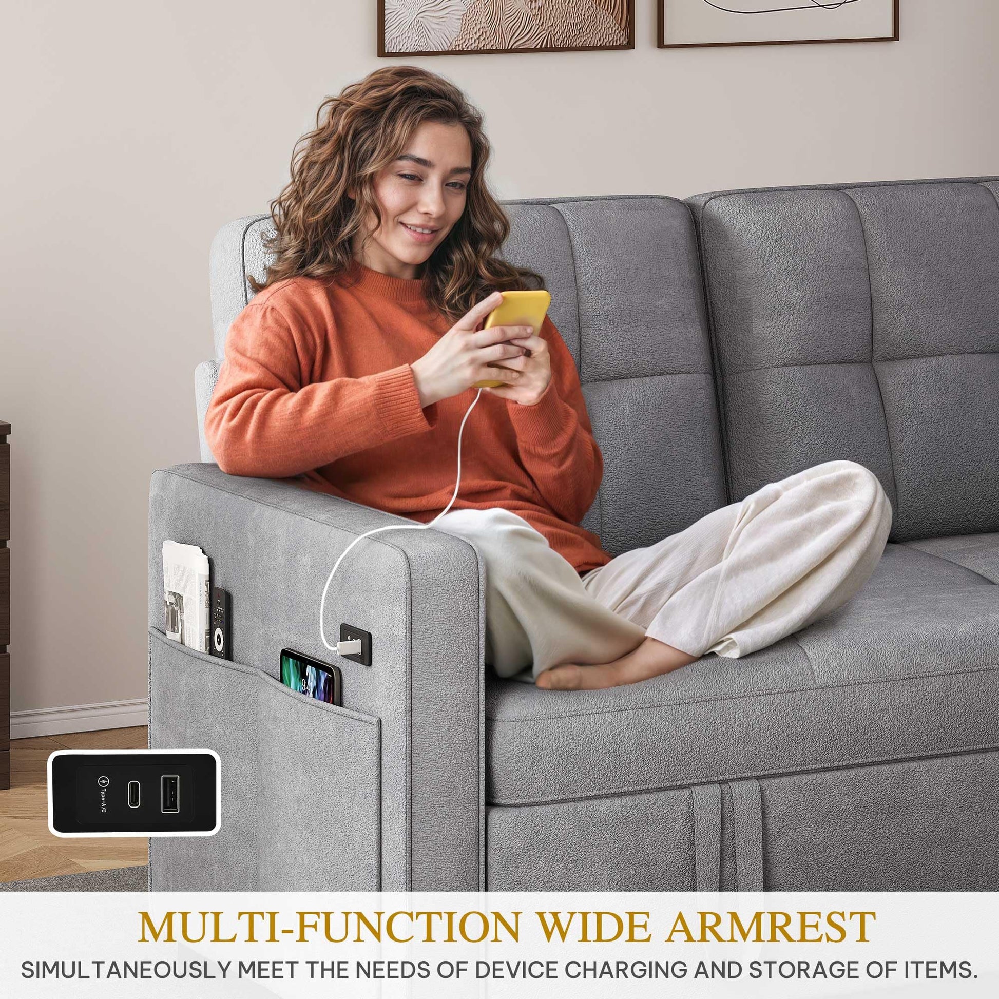 - Built-In Charging & Storage: Charge devices effortlessly with integrated USB and Type-C ports while relaxing. Side storage provides easy access to remotes, magazines, and essentials.