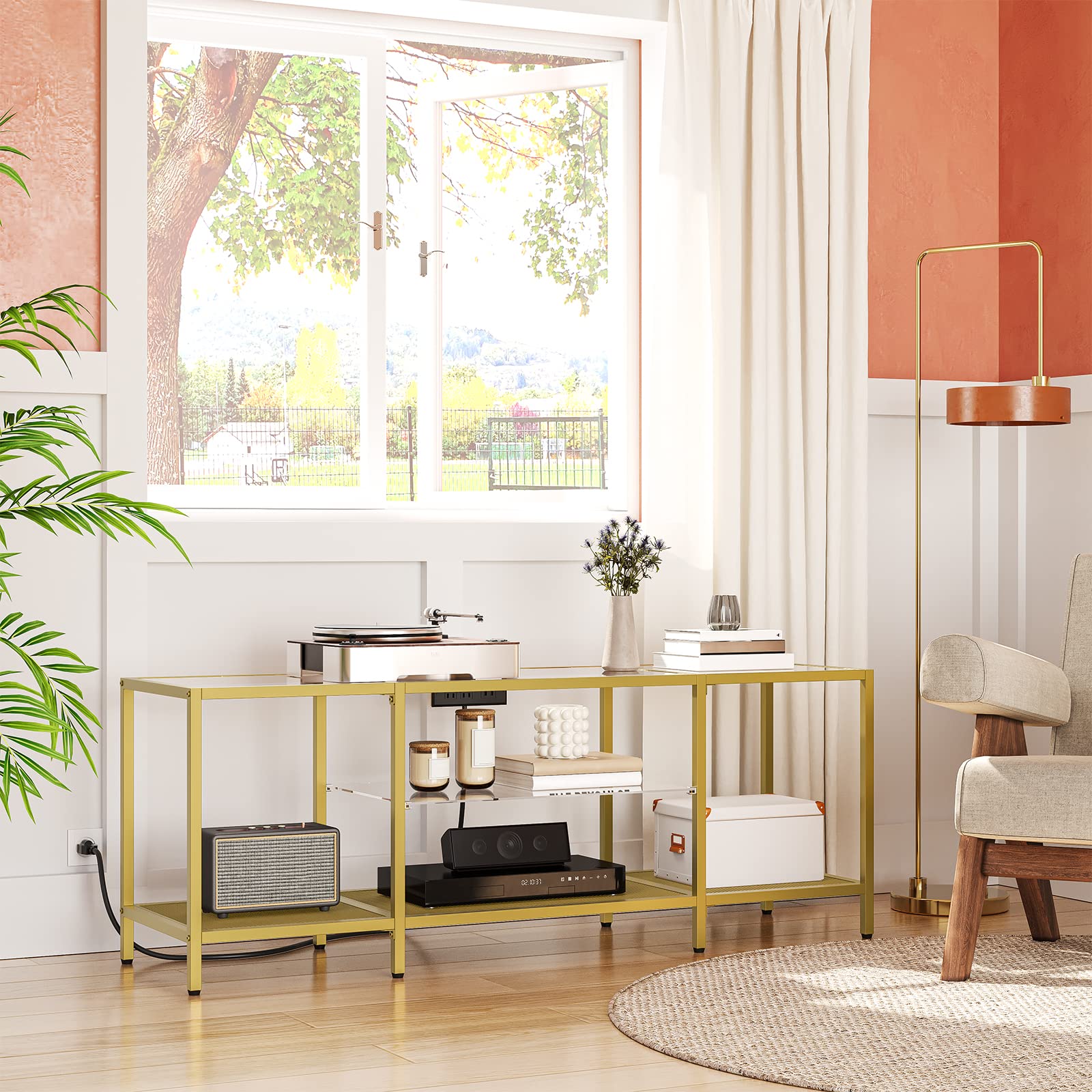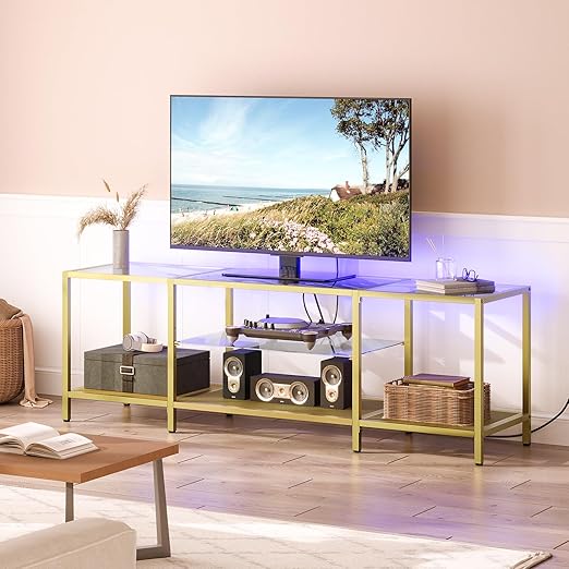 Modern tempered glass TV stand featuring integrated LED lighting and built-in power outlets. Designed to accommodate televisions up to 65 inches with three open shelves for media storage and display.