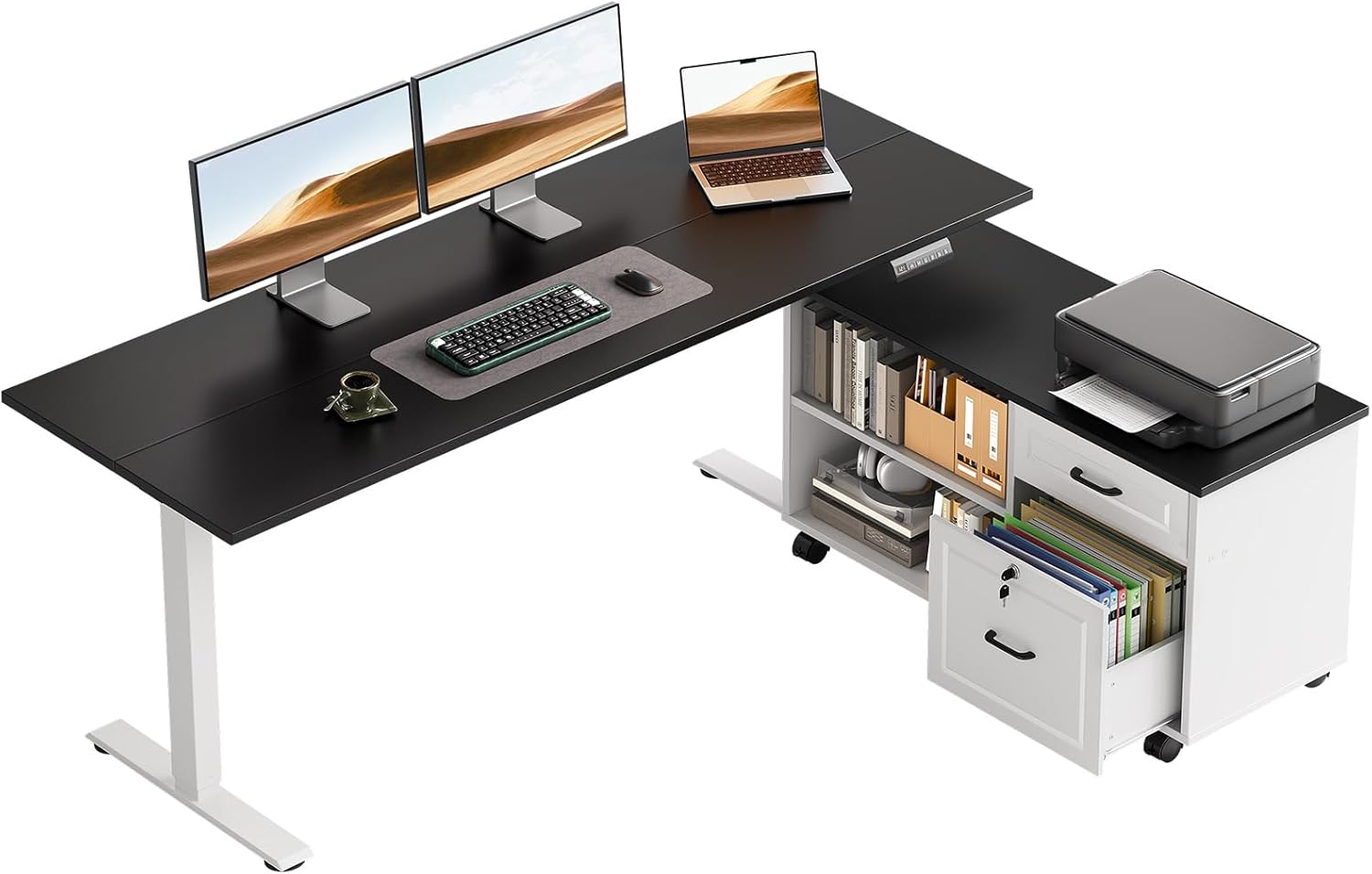 Transform your workspace with this premium L-shaped electric standing desk featuring integrated storage solutions. This executive workstation combines ergonomic height adjustment with practical organization, making it ideal for home offices and professional environments.