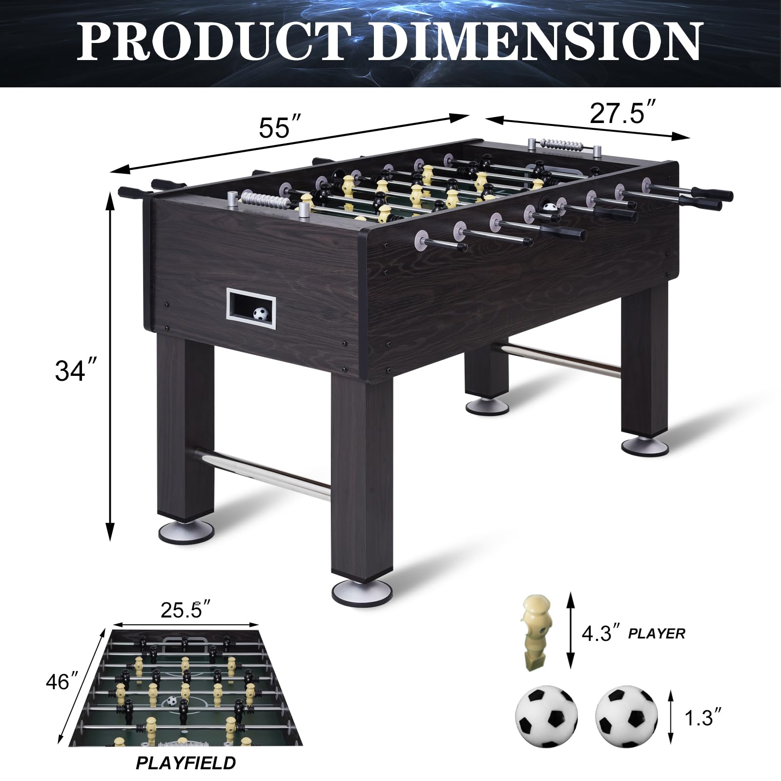 - 55-INCH FOOSBALL TABLE: This foosball table comes with 2 soccer balls, 2 goals, 2 scorers and 26 soccer players for 2 or 4 people to enjoy a thrilling gaming experience. The tabletop is 55 inches long and 27.5 inches wide, allowing you to pass and shoot in a large playing field.