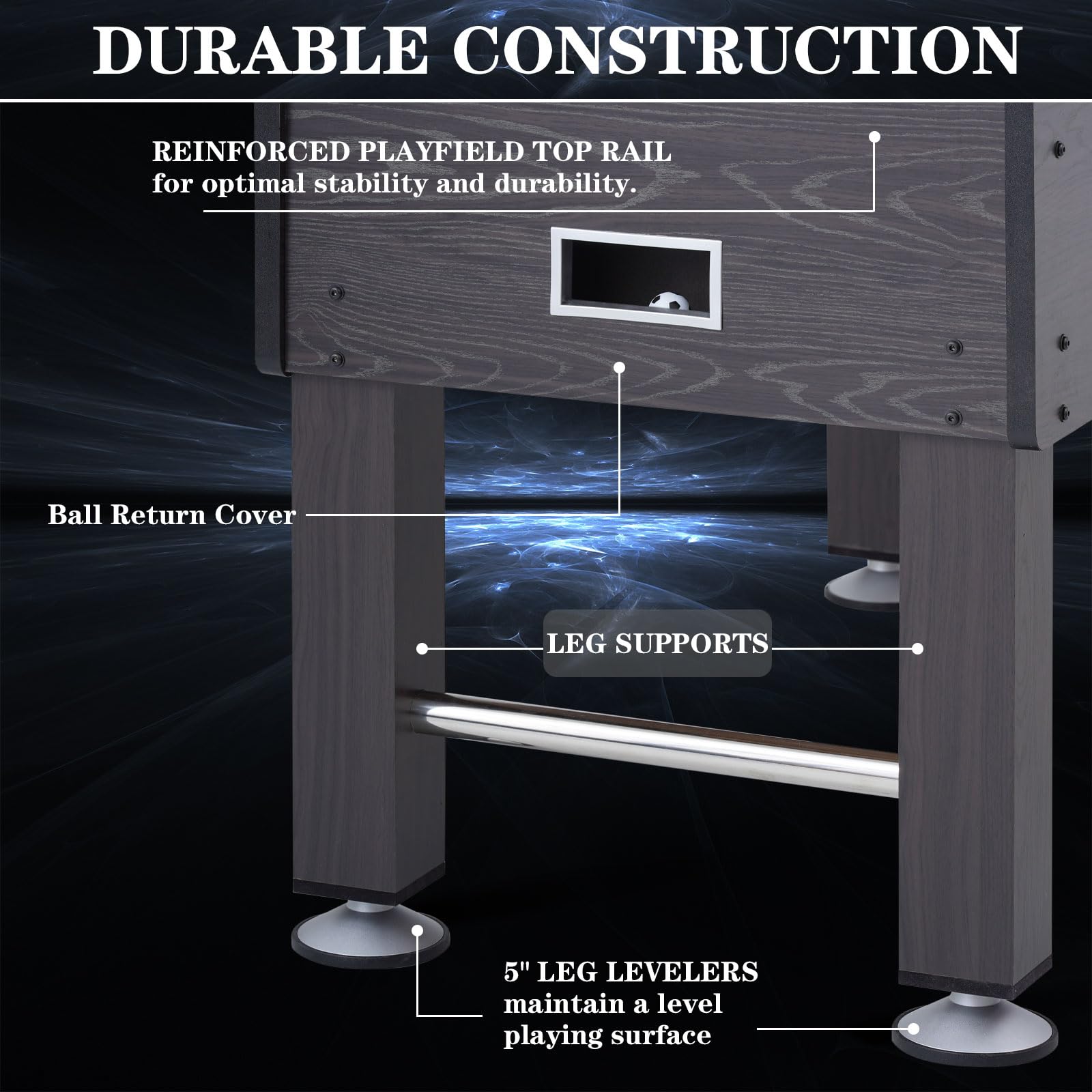 - STURDY AND RELIABLE CONSTRUCTION: This foosball game table is made of high-quality MDF material to ensure excellent sturdiness and long-lasting service life. Reinforced crossbars improve overall stability. Rounded corners prevent bumps and scratches. It has adjustable leg levelers to maintain stability even on uneven floors.