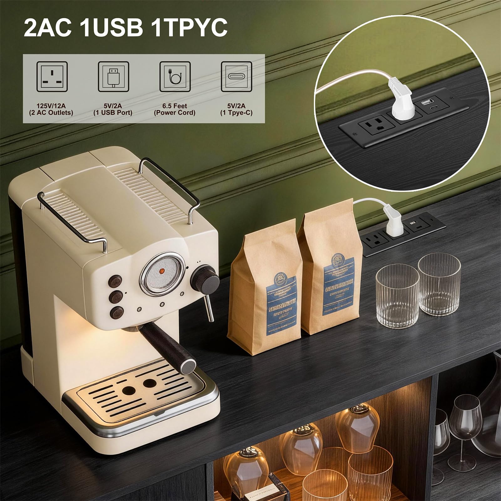 - Built-in charging station with 2 AC outlets and 2 USB ports