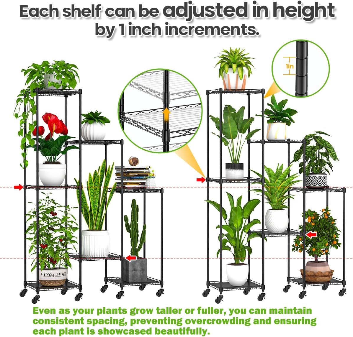 Transform your indoor or outdoor space with this versatile 7-tier plant display rack. Featuring adjustable shelf heights and smooth-rolling wheels for easy mobility, this metal plant stand accommodates up to 7 potted plants of various sizes.