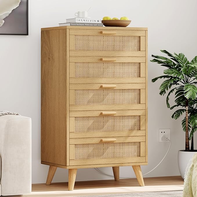 This modern wooden dresser combines natural rattan accents with elegant golden handles to create a sophisticated storage solution for your bedroom, living room, closet, or entryway.