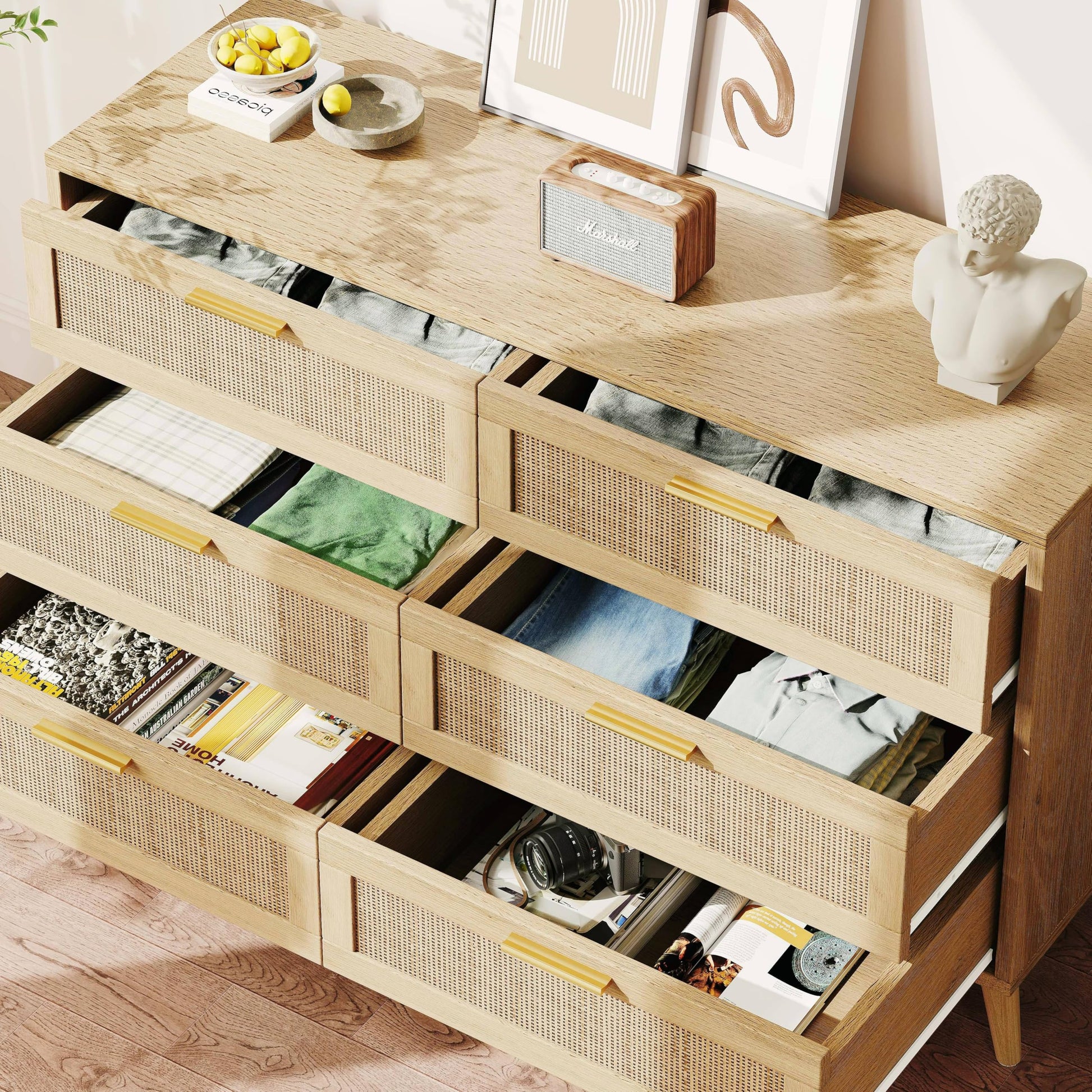 6 Drawer Double Dresser with Rattan and Golden Handles