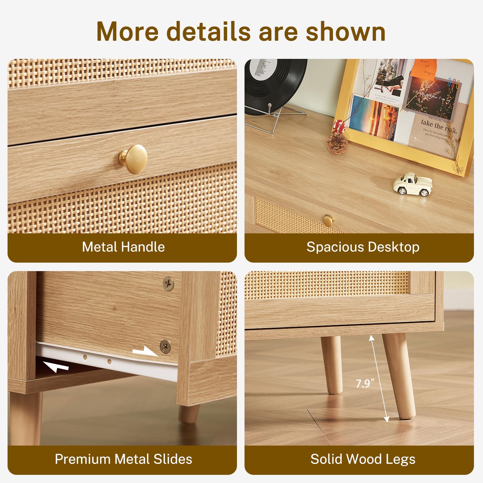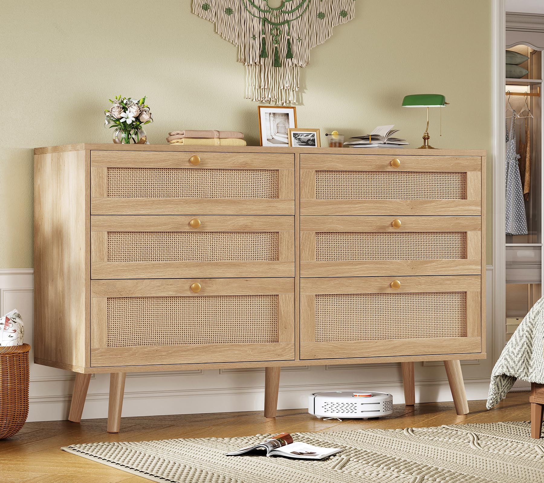 This double dresser combines functionality with boho-inspired design, featuring six spacious drawers and solid wood legs. Perfect for bedrooms, nurseries, entryways, or living rooms, this chest of drawers offers ample storage while maintaining a natural, stylish aesthetic.