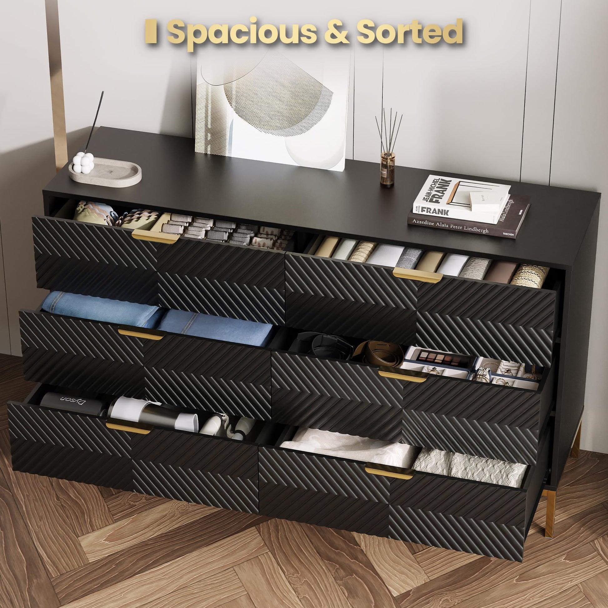 This modern dresser combines sophisticated style with practical storage. Featuring a striking black and gold finish with fluted wood detailing and textured chevron patterns, this piece elevates any bedroom, living room, or hallway.