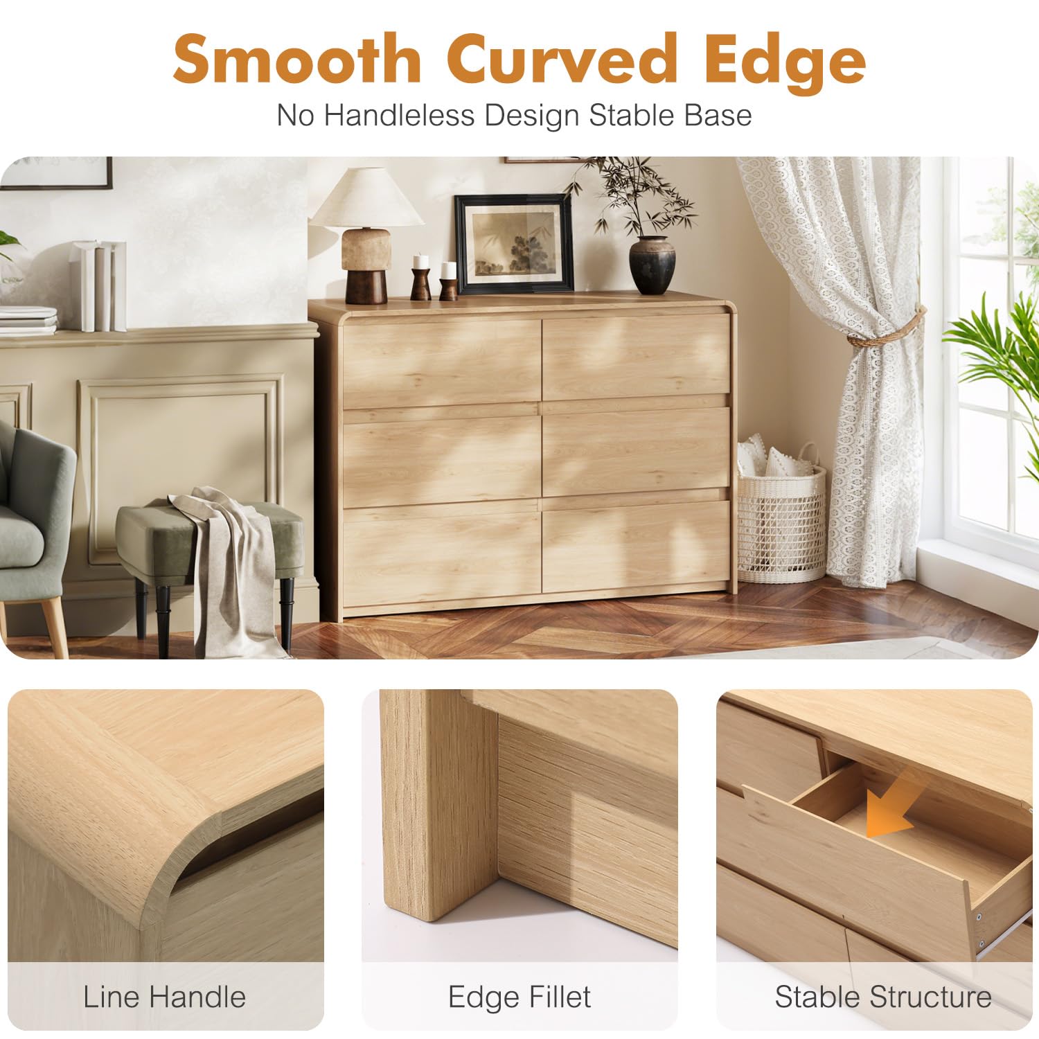 This contemporary dresser combines functional storage with elegant curved edge design, perfect for bedrooms and nurseries. Featuring six spacious drawers and a natural oak finish, this piece offers ample organization while enhancing your room's aesthetic.