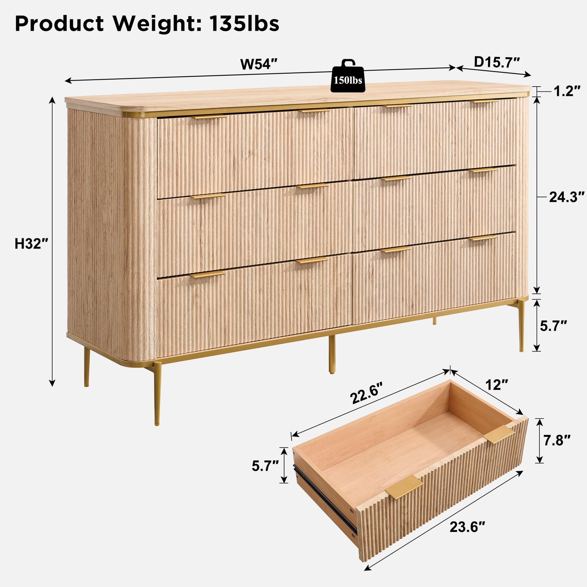 6-Drawer Dresser with Fluted Design and Gold Accents