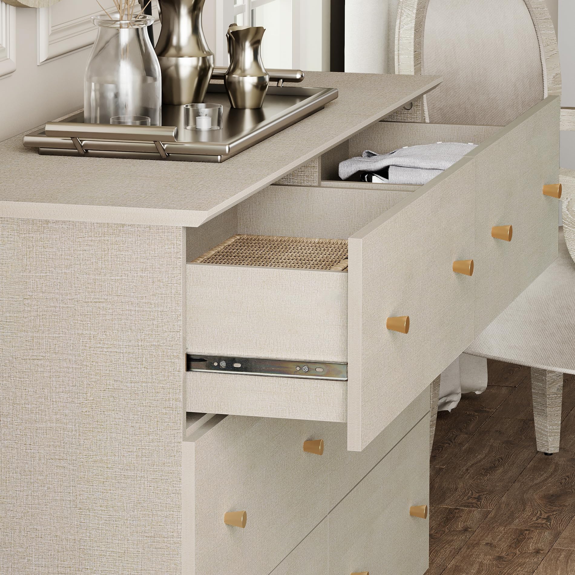 This spacious modern dresser offers versatile storage for bedrooms, living rooms, nurseries, and kids' rooms. Featuring elegant linen-textured finish with contrasting solid wood legs and classic gold pull knobs, this chest of drawers combines style with functionality.