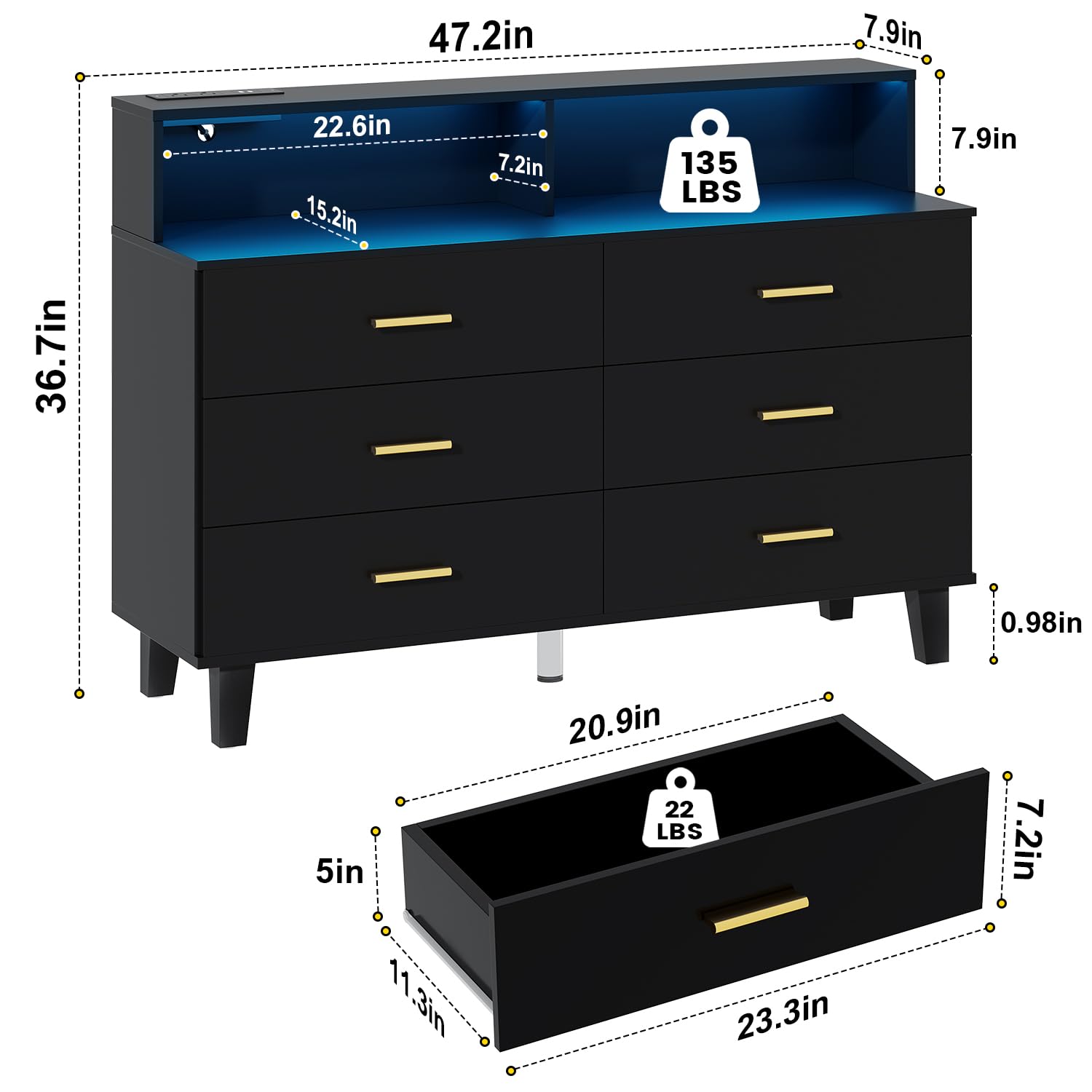 This 6-drawer dresser combines modern functionality with elegant design, featuring integrated LED lighting and a convenient power outlet. Perfect for bedrooms, entryways, and hallways, this large double dresser offers ample storage space while maintaining a sleek profile.