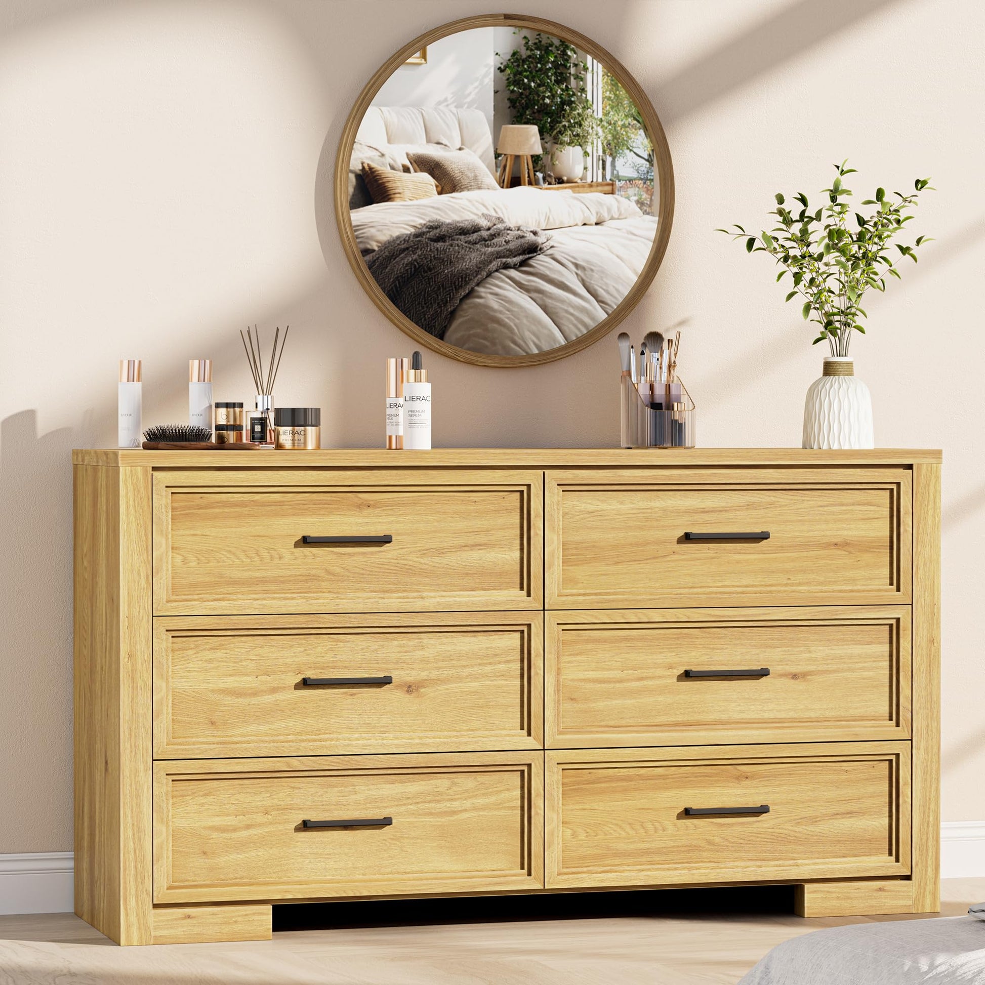 This modern storage dresser combines functionality with elegant design, featuring six spacious drawers perfect for organizing clothing, linens, and accessories. The natural oak finish adds warmth to any bedroom, living room, or hallway, while the sleek metal handles provide a contemporary touch.