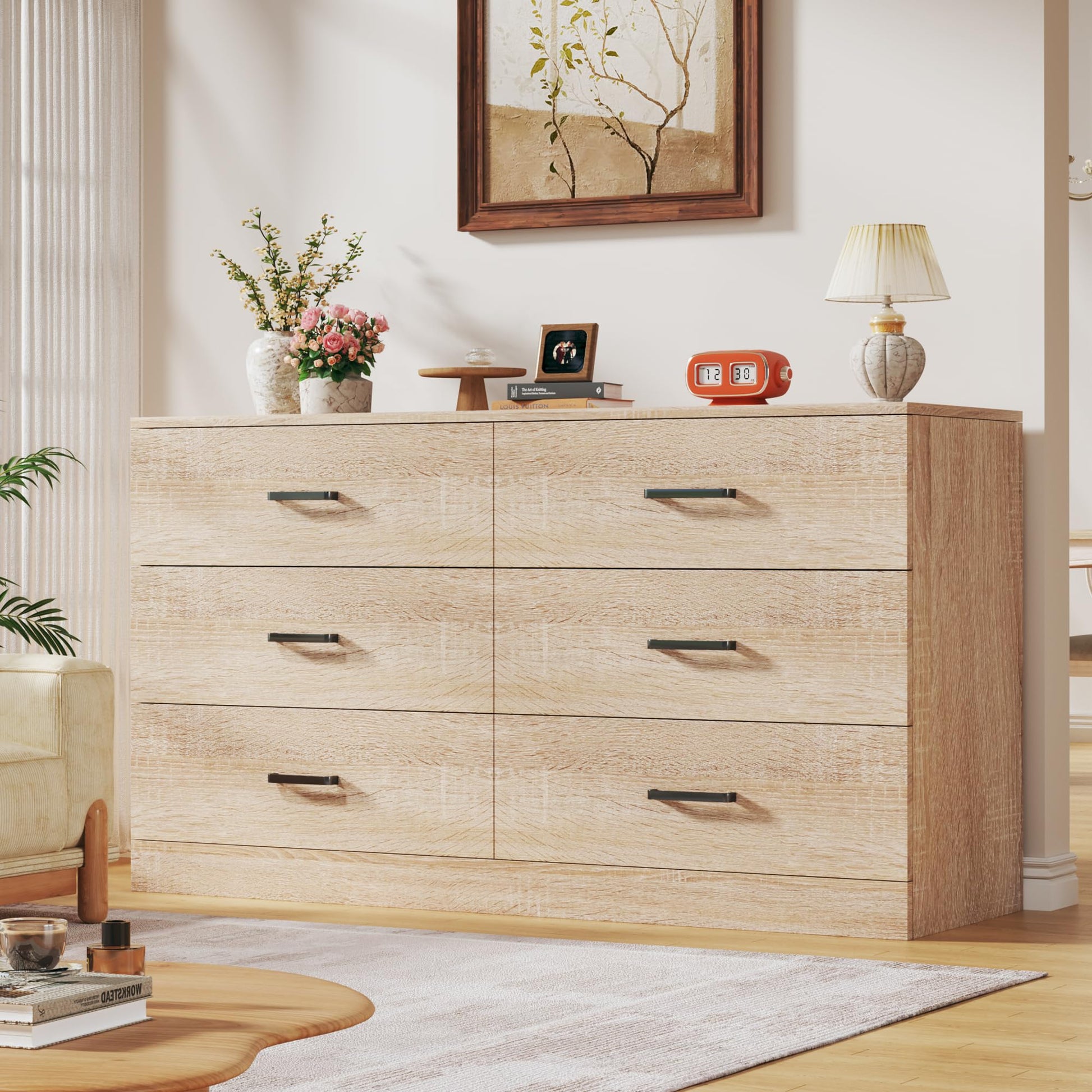 This mid-century modern dresser combines timeless design with practical storage solutions. Featuring six spacious drawers with sleek metal handles, this versatile piece serves beautifully as a bedroom dresser or TV stand for your living room or entryway.