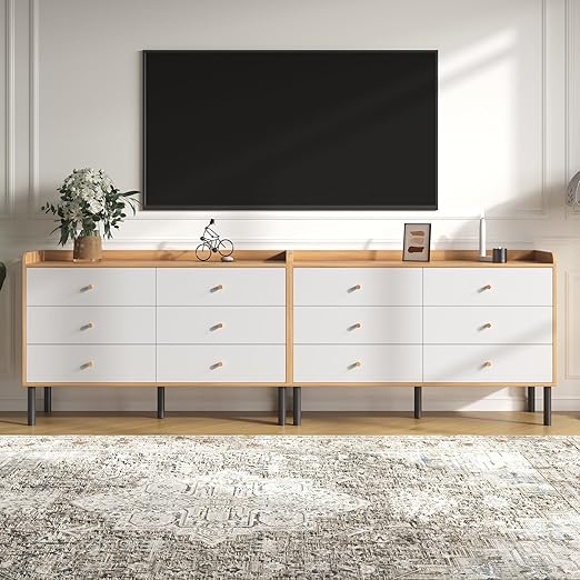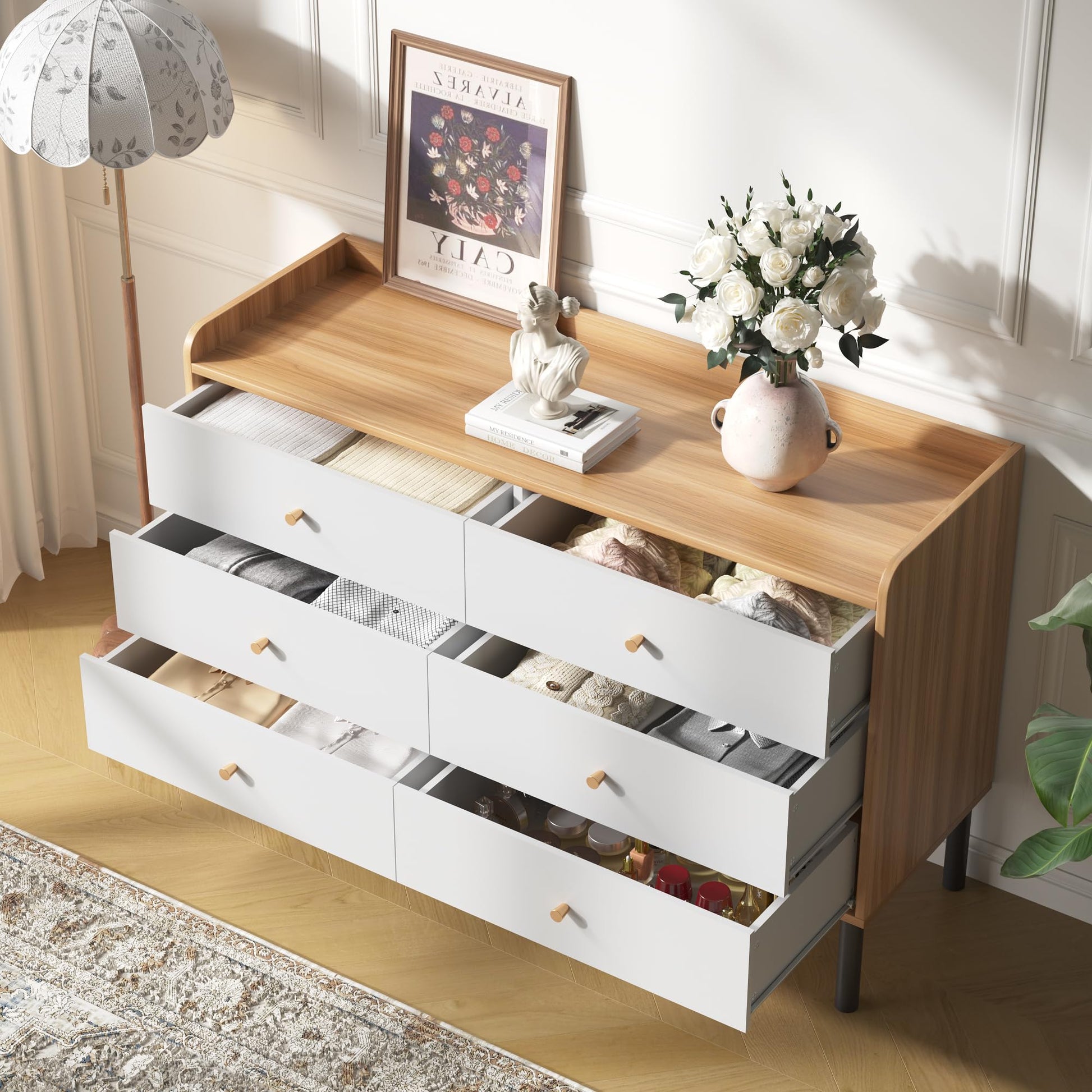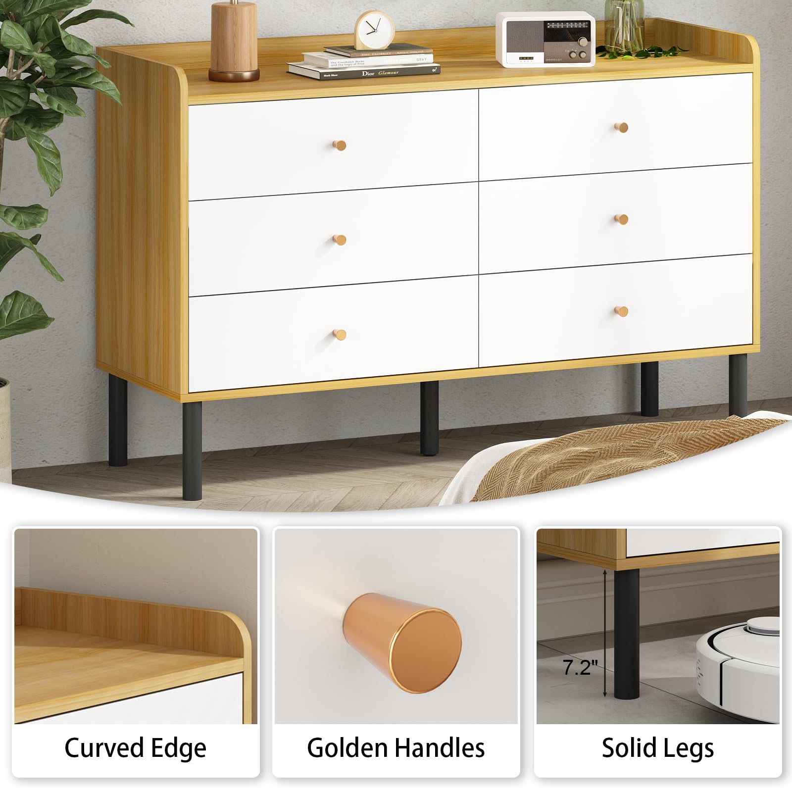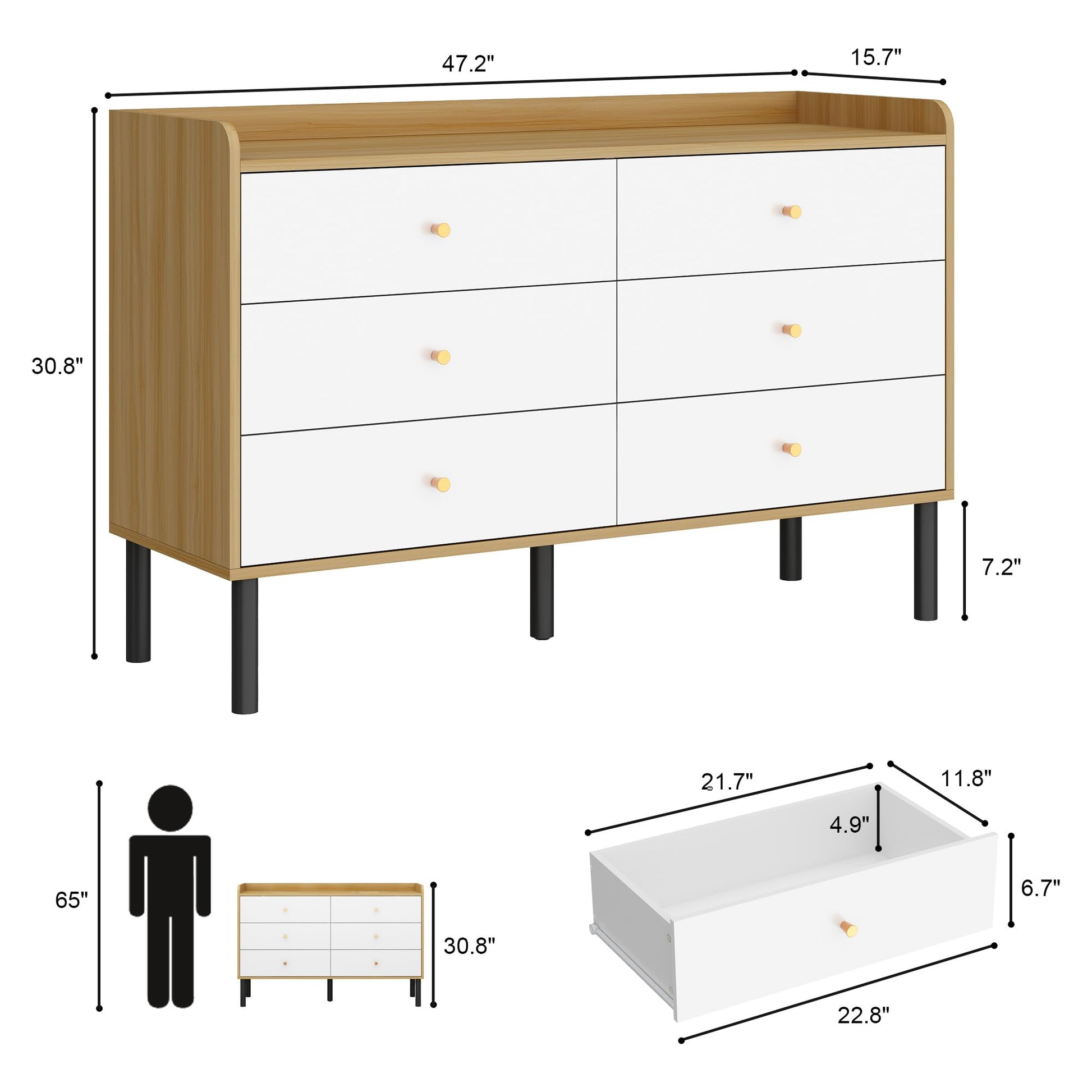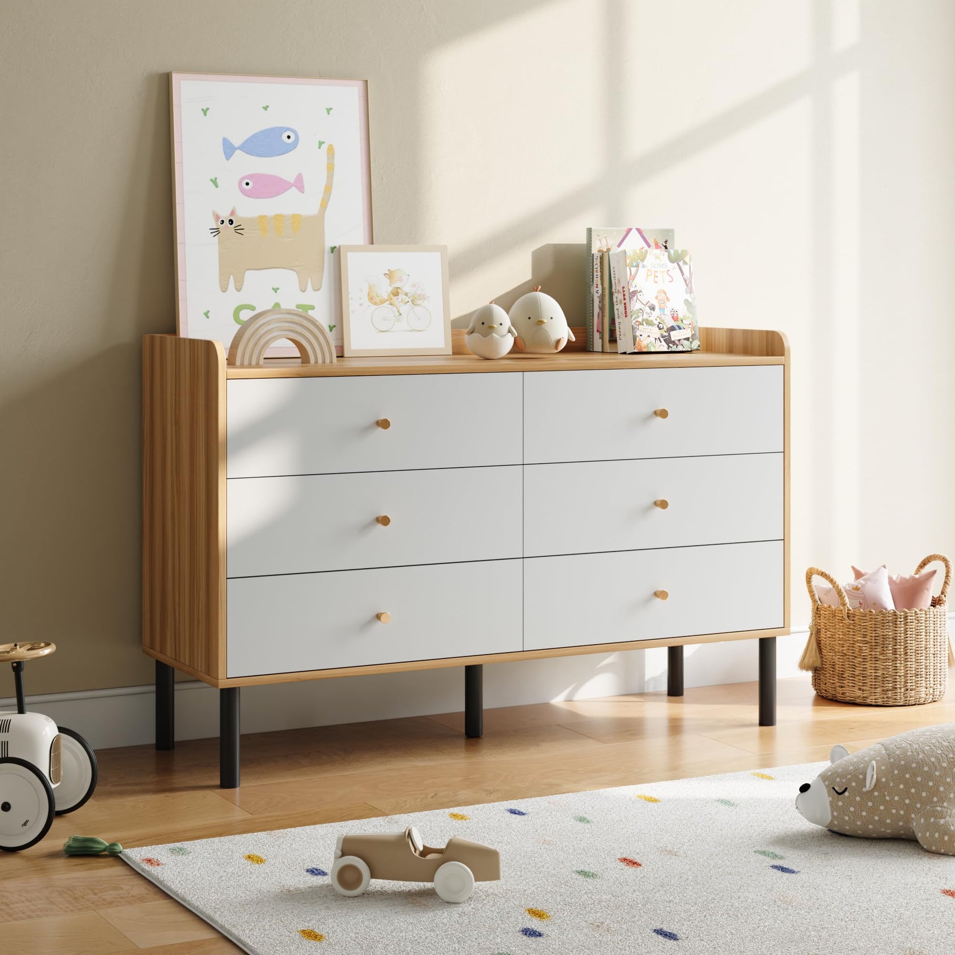 This modern wood chest combines functionality with elegant design, perfect for organizing your child's bedroom, nursery, hallway, or entryway. Featuring six spacious drawers with stylish golden handles, this dresser provides ample storage while adding a sophisticated touch to any room.