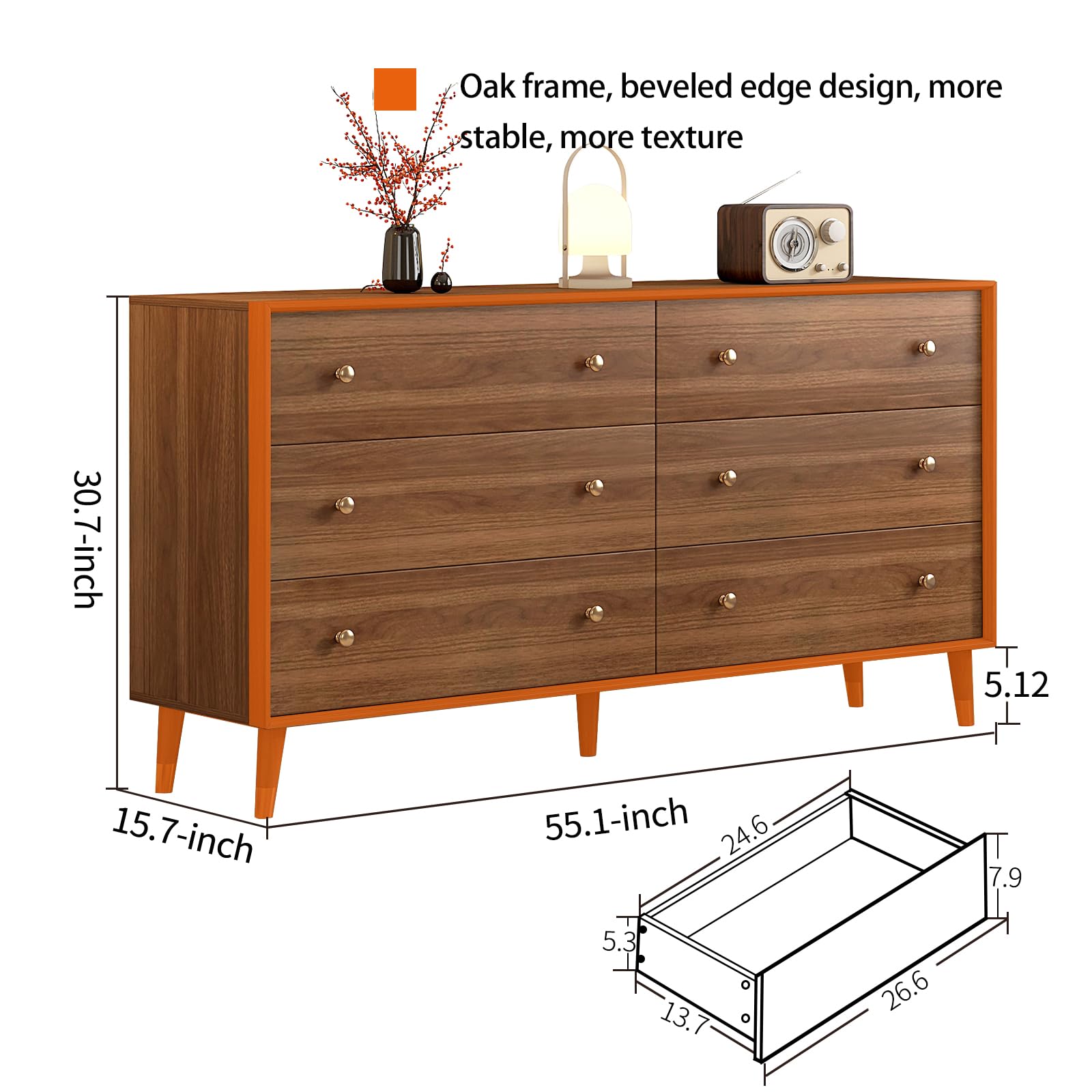This mid-century modern dresser combines elegant walnut finish with practical storage and entertainment functionality. Featuring six spacious drawers and pre-embedded slots for TV stand use, this versatile piece works beautifully in bedrooms, living rooms, hallways, or offices.