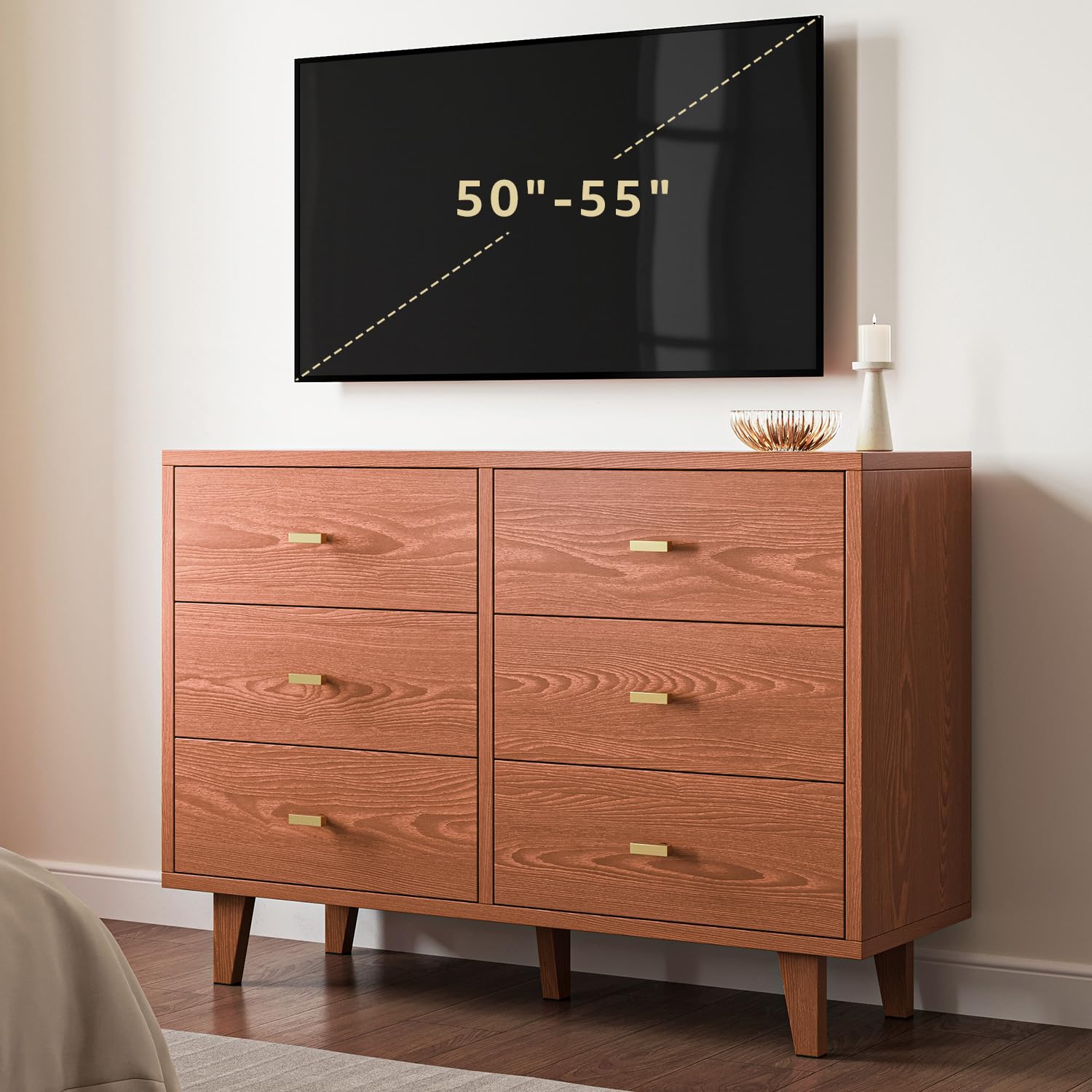 6 Drawer Walnut Wood Dresser 47 Inch Mid-Century Chest