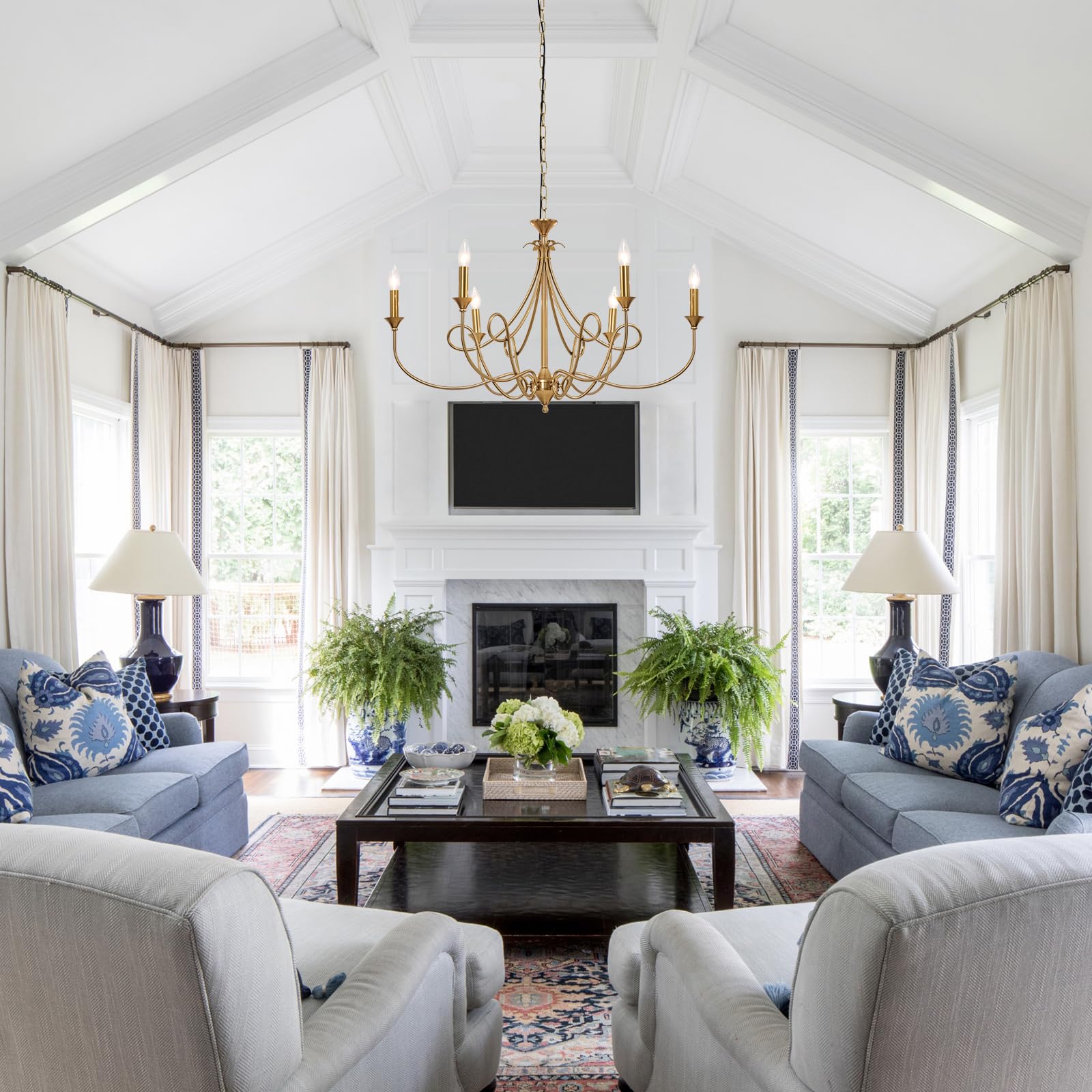 This elegant 6-light modern chandelier features a sophisticated brass finish with candle-style design, perfect for elevating your interior spaces. The metal gold pendant light fixture combines contemporary aesthetics with timeless appeal, making it an ideal centerpiece for dining rooms, living rooms, kitchen islands, foyers, and entryways.