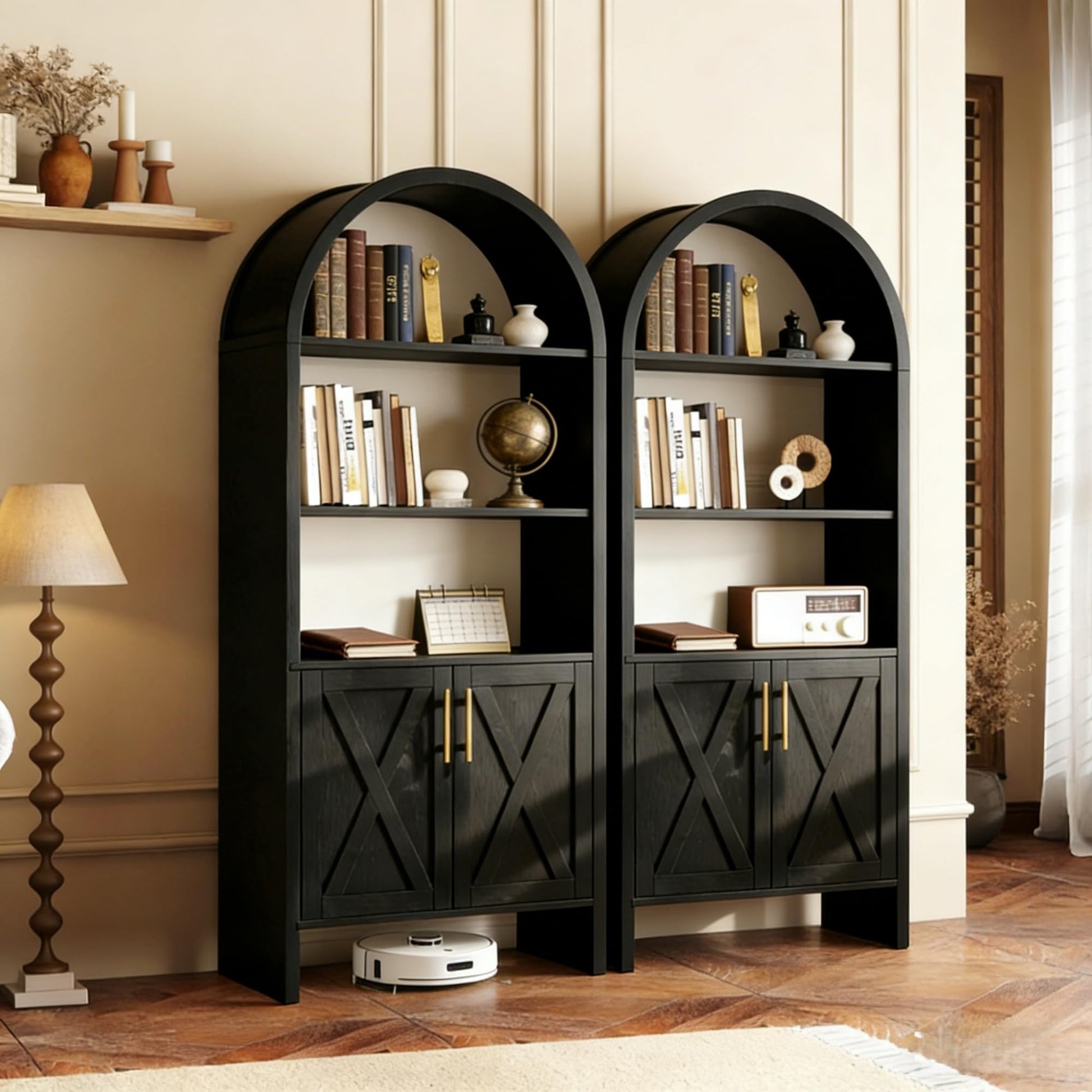 This elegant arched bookshelf combines modern farmhouse aesthetics with practical storage solutions. Featuring a distinctive arched design with natural wood grain finish, this freestanding cabinet offers both open shelving and enclosed storage to organize books, decorative items, and household essentials.