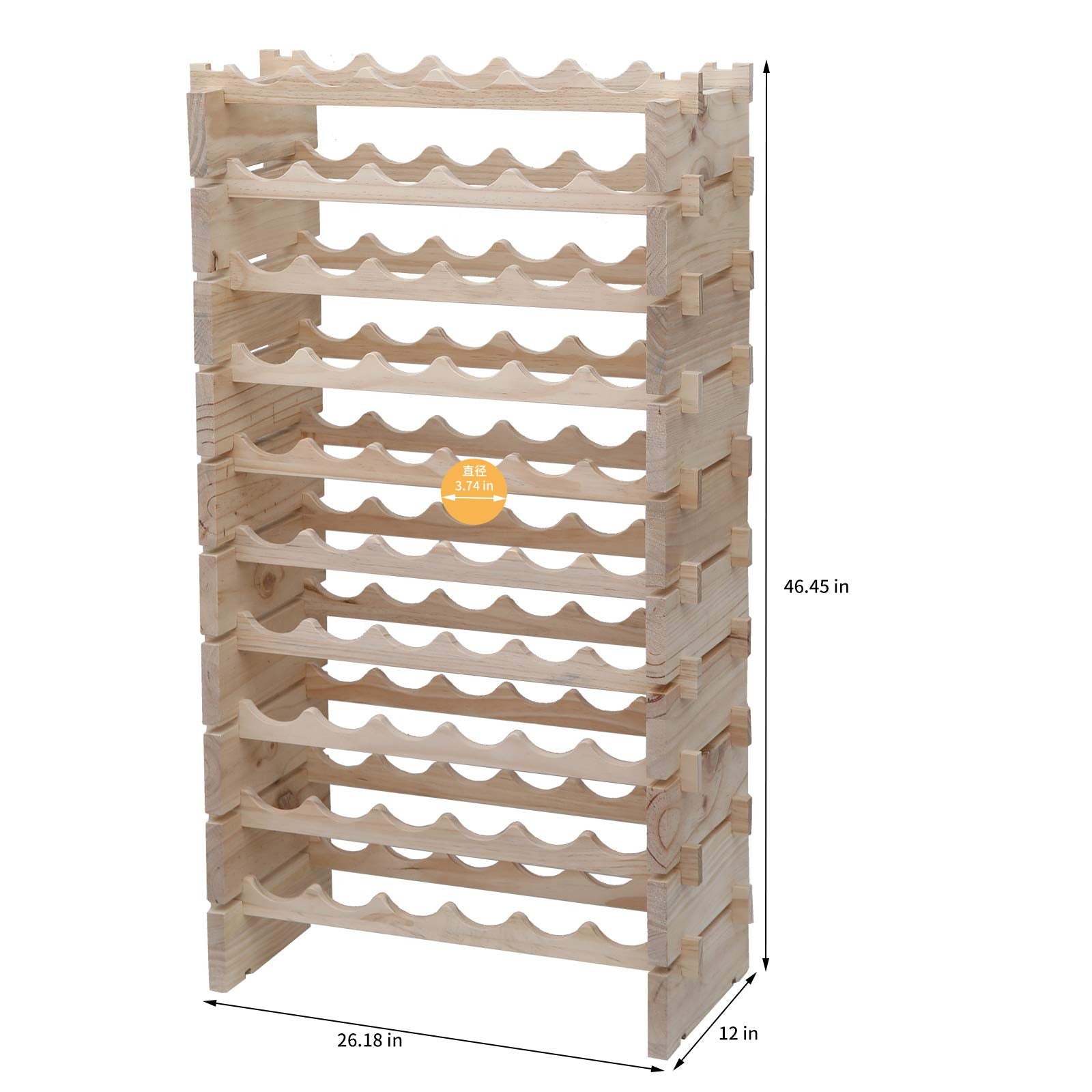 This solid pine wine rack offers sturdy, stackable storage for up to 60 standard 750ml wine bottles. Crafted from high-quality pine wood with a thickened construction, this floor-standing wine cabinet features a modern design with a natural color finish. The easy assembly design requires no nails or screws—simply tap pieces together with a hammer for quick setup.
