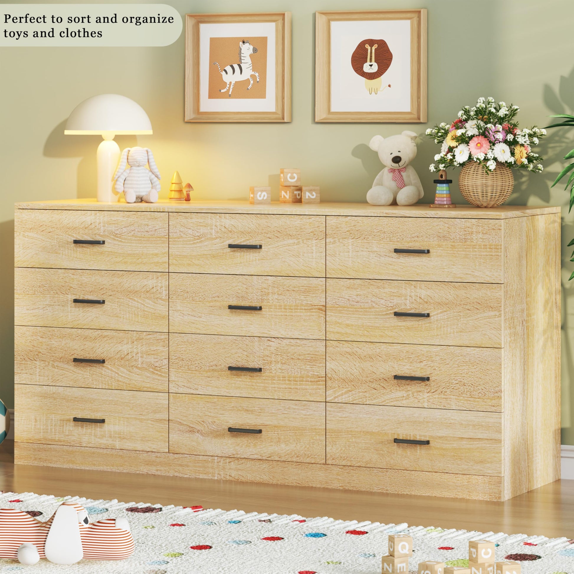 This spacious 12-drawer dresser combines mid-century modern design with practical storage solutions. Crafted from quality wood with a natural finish, this versatile piece functions as both a bedroom dresser and TV stand for screens up to 65 inches.
