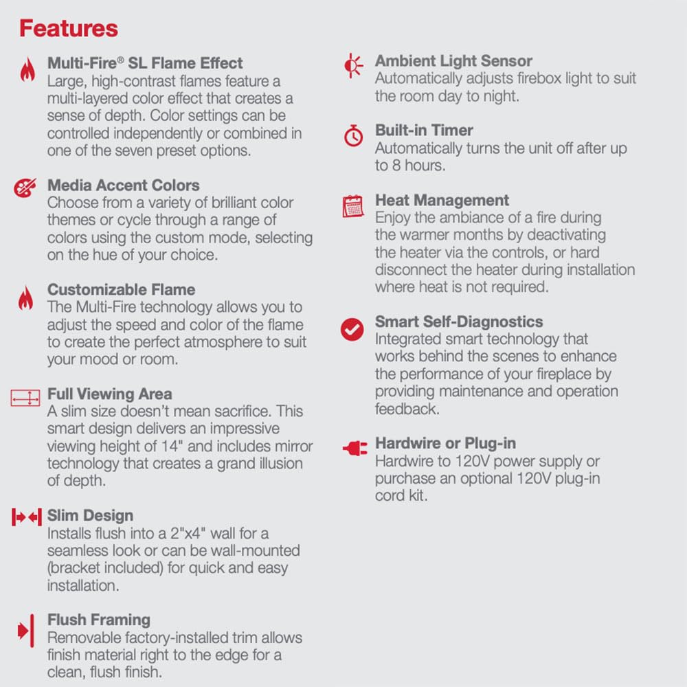 - LED multi-color flame technology with customizable settings